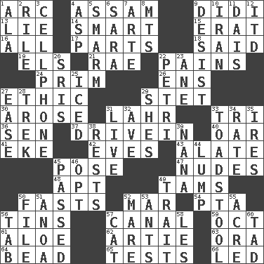 ACROSS 1. Curve 4. Indian state 9. "You Light Up My Life" star Conn 13. Falsehood 14. Don Adams' spy role 15. Part of Q.E.F. 16. 100% 17. Actors' quests 18. Expressed in words 19. Raised railways 21. Actress Charlotte 22. Aches 24. Demure 26. Followers of ems 27. Value system 29. Proofreading order 30. Came up 31. Cowardly lion portrayer 33. Three (prefix) 36. Elected rep. 37. Popular '50s hangout 40. Boat paddle 41. Make supply last 42. Nights before holidays 43. Having winglike extensions 45. Airs 47. Unclothed pictures 48. Fitting 49. Scottish caps 50. Goes without food and/or water 52. Impair 54. Parent Teacher Association (abbr.) 56. Metal containers 57. Lessep's creation 59. Sep. follower 61. Medicinal plant 62. Nick name for Arthur 63. Mouth or opening 64. Necklace unit 65. Trials 66. Directed DOWN 1. Wing 2. Cause heat under the collar 3. Portable communications device 4. Cleo's killer 5. Excessive but superficial compliments 6. "Two Mules for Sister ____" 7. Johnson of "Laugh-In" 8. Mountains (abbr.) 9. Cease 10. SW Asia republic 11. Raised platform 12. It would 20. Indian titles of respect 22. _ dish (used to culture cells) 23. A saturated hydrocarbon 25. On the rocks 27. Comfort 28. Long journey 29. "______ My Girl" (Turtles hit) 31. Not recorded 32. "___ Maria" 33. Inedible or poisonous agaric 34. Pace 35. Angers 38. Musical pauses 39. Nanny 44. Mass 45. Went by 46. Choose 49. Distinguishing feature 50. Do some clerical work 51. Small Philippine buffalo 52. Female horse 53. Pismires 55. Measure of real estate 56. Keyboard key 57. Domesticated feline 58. French article 60. Small boy