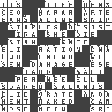 ACROSS 1. It is 4. Small quarrel 8. Habitations of wild animals 12. Corporate head (abbr.) 13. Ethiopian city, capital of Harari 14. Johnson of "Laugh-In" 15. Hearing organs 17. Place in a line 18. Sever or remove by pinching or nipping 19. Paper fasteners 21. Stop 23. Retirement account (abbr.) 24. A female animal or person 26. Pass on 27. Comedian Laurel of Laurel & Hardy 28. Leg joint 30. Biblical high priest 31. Food allowance for one day 34. Heredity factor (abbr.) 37. Nilotic language 38. Make improvements or corrections to 39. Soggy 40. Elected rep. 41. Break 42. Compass dir. 43. Pacific island yam 44. Table seasoning 46. For each 47. Born 50. Pipe bend 51. Flew 54. Deli grouping 57. Writer Wiesel 58. Declaim 60. Small Philippine buffalo 62. Gone 63. Moved through 64. Separate the seeds from cotton 65. Sense of smell 66. Count _ (2 wds.) 67. _ Lanka DOWN 1. Frozen water 2. Afternoon social gatherings 3. Conclusion 4. Stories 5. From or relating to Ireland 6. Air blower 7. Flintstone 8. Hyrax 9. Bert's buddy 10. Nuclear Threat Initiatives 11. Back-to-school mo. 13. Actor Linden 16. "Two Mules for Sister ____" 20. Baking dish 22. Paradise 25. Supplementing with great effort 27. Change direction abruptly 29. Connecting point 30. Raised railways 31. Rump 32. ID or VA city 33. Afternoon social gathering 34. Homes 35. A home for chicks 36. Had dinner 41. Have the gumption 43. Cylindrical with tapered ends 44. Ocean 45. _ mater 46. Aches 48. 1973 Nobel Price Winner (Physics) Leo 49. Consumed 51. Stitched 52. Margarine 53. Dormintory (informal) 55. Directed 56. Fly high 59. Actress Charlotte 61. Cuckoo