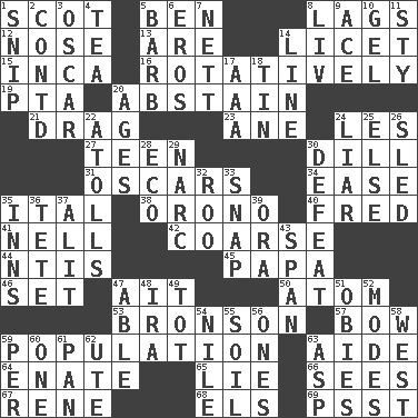 ACROSS 1. Highlander 5. Benjamin's nick name 8. Fails to keep up a pace 12. Olfactory organ 13. "We ___ not amused" (Victoria) 14. It is permitted: Lat. 15. South American Indian 16. Producing rotation 19. Parent Teacher Assoc. 20. Refrain by choice 21. To be drawn or hauled along 23. One (Scot) 24. French article 27. Adolescent 30. Deli pickle 31. Motion picture awards 34. Comfort 35. Slanted text style (abbr.) 38. U. of Maine site 40. Flintstone 41. 1994 drama film starring Jodie Foster 42. Rough 44. Nuclear Threat Initiatives 45. Dad 46. Arrange properly for use 47. Small island 50. Tiny particle 53. "Death Wish" actor 57. Arrow shooter 59. Census information 63. Helper 64. Related on the mother's side 65. Falsehood 66. Perceives with the eye 67. French philosopher Descartes 68. Raised railways 69. Inconspicuous attention getter DOWN 1. Clip 2. Continued (abbr.) 3. Witty Wilde 4. Afternoon social gathering 5. Sharp remark 6. Greek god of love 7. Remaining after all deductions 8. 54 in ancient Rome 9. Adept person 10. Set 11. Filthy place 14. Actor's bit 17. Auto club (abbr.) 18. Shallow baking pan 20. Grows older 22. Ringlike coral islands and reefs 24. One who doesn't tell the truth 25. Otherwise 26. Downhill vehicle 28. Environmental prefix 29. Drug cop 30. Outscore 32. Friend of Pooh 33. Fastener 35. Lodging establishments 36. Wig 37. Came down and settled, as after flight 39. Mouth or opening 43. Connect, as a bridge 47. Competent 48. Retirement account (abbr.) 49. Small child 51. Off-Broadway awards 52. Methods 54. Mediterranean tributary 55. The visible part of the earth's surface 56. Washington bills 58. 270 degrees 59. For each 60. Single 61. Baking dish 62. Shoshoni 63. Cleo's killer