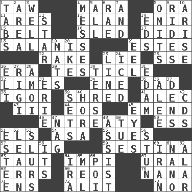ACROSS 1. The 23rd letter of the Hebrew alphabet 4. Hindu Mythology: god of death 8. Mouth or opening 11. Ancient Greek god of war 13. Flair 14. Independent ruler or chieftain 15. Waist strap 16. Downhill vehicle 17. "You Light Up My Life" star Conn 18. Deli grouping 21. _____ Park, CO 22. Immoral or dissolute person 23. Whopper 25. Compass dir. 26. Epoch 29. One of the two male reproductive glands 32. Citrus fruits 34. Compass dir. 35. June honoree 38. Composer Stravinsky 39. Tear up 41. Actor Baldwin 43. One more than two 44. Greek goddess of the dawn 45. Make improvements or corrections to 46. Plea 50. Double-curved letter 51. Raised railways 54. White ___ sheet 55. Takes to court 57. Major League Baseball Commissioner Bud 59. French poetic form 63. Drawn tight 64. Body of Kaffir warriors 67. Mountain range 68. Blunders 69. Vintage cars 70. Grandmother 71. Followers of ems 72. Came down and settled, as after flight 73. And not DOWN 1. Bar bills 2. Length times width 3. Water source 4. Makes clutter 5. 100% 6. Actress Charlotte 7. Added to 8. Leaves out 9. Amusement-park features 10. Get up 12. Play the lead 14. Begley and Asner 19. Floor coverings 20. Mamie's mate 21. Snakelike fish 23. Actor's bit 24. On the rocks 26. Connecticut Ivy Leaguer 27. Swiss mountan, "Queen of the Mountains" 28. Mine, in Marseilles 30. Laconic 31. Dutch treat 33. 4th largest of the Great Lakes 36. Toward shelter 37. Hiding places for outlaws 39. Arranges properly for use 40. Israeli folk dance 42. Music discs 45. Snake ____ (dice throw) 47. Tired old horse 48. Aid 49. Third day of the wk. 51. First name in cosmetics 52. Acquire or gain knowledge or skills 53. Disparaging remarks 56. Make senseless or dizzy 58. It is 60. SW Asia republic 61. Billionth: prefix 62. Having or resembling wings 64. Lyricist Gershwin 65. Cartoonist voice _ Blanc 66. Luau course