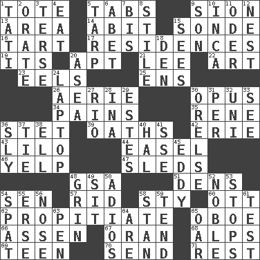 ACROSS 1. Carryall 5. Bar bills 9. The Jewish people; Israel 13. Type of rug 14. "This won't hurt ____!" 15. Something which is sent 16. Small pie 17. Homes 19. ___ a Wonderful Life 20. Fitting 21. Area sheltered from the wind 22. Tate display 23. Snakelike fish 25. Followers of ems 26. Nest on high 30. Musical composition 34. Aches 35. French philosopher Descartes 36. Proofreading order 39. Expletives 42. 4th largest of the Great Lakes 43. _ and Stitch 44. Artist's stand 46. Sharp bark 47. Bobsleighs 48. Girls' org. (abbr.) 51. Hiding places for outlaws 54. Elected rep. 57. To free from 58. Filthy place 60. Baseball player Mel 62. Appease 65. Mitch Miller's instrument 66. NE Netherlands city 67. NW Algerian seaport 68. High mountains 69. Adolescent 70. Post 71. Repose DOWN 1. Jacques of French films 2. Declaim 3. Laconic 4. Ingest 5. Canvas cover 6. Collude with 7. Altar cloth linen 8. Vertical member of a panel or frame 9. Manchild 10. South American Indian 11. Baltic tributary 12. Egg locale 15. Observes 18. Lair 20. At sea 24. Portable computer 27. _ de Janeiro 28. _ tizzy (2 wds.) 29. _____ Park, CO 30. Threatening words 31. For each 32. University (slang) 33. Observe 36. Wily 37. Standoff 38. Pipe bend 40. Actor Linden 41. Compass dir. 45. Whirlpool 48. Smile widely 49. Be seated 50. Goodbye (Sp.) 52. Having high moral qualities 53. Constricts 54. Petty quarrel 55. Celtic language 56. Characteristic smell of wine 58. Comedian Laurel of Laurel & Hardy 59. Watch over 61. Trial 63. Writing instrument 64. "We ___ not amused" (Victoria) 65. Rowing implement