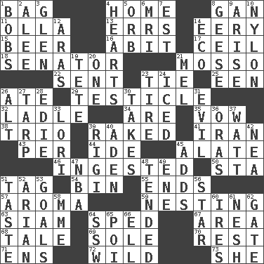 ACROSS 1. Container for groceries 4. Residence 8. Separate the seeds from cotton 11. Water jar 13. Blunders 14. Suggestive of the supernatural 15. Fermented drink made from hops 16. "This won't hurt ____!" 17. To provide with a ceiling 18. Legislator 21. With motion or animation 22. Posted 23. Make a knot 25. Car or cant ending 26. Had dinner 29. One of the two male reproductive glands 32. Dipping utensil 34. "We ___ not amused" (Victoria) 35. Solemn pledge 38. Musical group of three 39. Moved through 41. SW Asia republic 43. For each 44. Binary compound 45. Having winglike extensions 46. Eaten 50. R.R. building 51. Label 54. Storage container 55. Extremities 57. Scent 59. Inhabiting a nest 63. Thailand, formerly 64. Broke a traffic law 67. Type of rug 68. Lie 69. Flatfish 70. State of inaction 71. Followers of ems 72. Rampant 73. A female animal or person DOWN 1. Moves up and down 2. Toward shelter 3. Small, secluded valley 4. Centers of feelings and intuitions 5. Globe 6. Medical imaging device (abbr.) 7. Eastern Standard Time (abbr.) 8. Honkers 9. Originate 10. High-strength synthetic material 12. Ancient river in northeast Turkey 14. Environmental prefix 19. False hair 20. Single 21. Cartoonist voice _ Blanc 23. Become fatigued 24. On the rocks 26. The first octave above the treble staff 27. Canvas cover 28. Singer Brickell 30. Proceeds 31. Morally bad or wrong 33. Australian parrot (variant) 36. Mouths or openings 37. Electrical Unit 39. Swiss mountan, "Queen of the Mountains" 40. An important port of Yemen 42. Teachers' org. 45. Does sums 47. Basketball assoc. 48. Looked after 49. Compass dir. 51. Clothes sense 52. Believer in; advocate of (suffix) 53. Finish lines 56. Play the lead 58. Madame (abbr.) 60. Angers 61. Delicate 62. Yard entry 64. Compass dir. 65. Luau course 66. Pipe bend