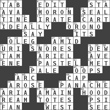 ACROSS 1. Bar bill 4. Prepare for publication 8. R.R. building 11. Actress Gardner 12. Person of subnormal intelligence 14. Lick closed 15. Prong on a fork 17. Feeling or showing extreme anger 18. Heavy open wagon 19. Under perfect conditions 21. U. of Maine site 23. Declare 24. ___ a Wonderful Life 25. Cassini of fashion 27. Among 30. RI univ. 31. Sounds asleep 34. Morning condensation 37. Scottish cap 38. Satellite of Uranus 39. "___ Maria" 40. Compass dir. 41. Soft color 43. Was introduced to 44. Light colored 45. I made a mistake 47. Curve 49. Head covering 50. Came up 52. Flamboyance 56. Operatic vocal solo 57. With great haste 60. Parka part 61. 480, 500 or 516 sheets of paper 62. Lugs 63. Air pressure measure (abbr.) 64. Air blower 65. Compass direction 66. Observe DOWN 1. Jacques of French films 2. Enthusiastic 3. Object of repulsion 4. Poet Dickinson 5. Small, narrow, flatbottom fishing boat 6. Lyricist Gershwin 7. Small child 8. Actors Connery and Penn 9. Edible starchy tuberous root 10. The first octave above the treble staff 13. Modern: prefix 14. Native of Scotland 16. Relaxation 20. Straggles 22. To free from 25. NW Algerian seaport 26. Welles in "The Third Man" 27. Get up 28. Rendezvous 29. Small island 30. Shoshoni 32. California wine valley 33. Taken by mouth 34. Moist 35. Nights before holidays 36. Dripping 42. Grant temporary use of 44. Personal Computers (abbr.) 46. Brightly colored fish 47. Believer in; advocate of (suffix) 48. Wander 49. 2nd pers. sing. pres. of can (arch.) 50. Type of rug 51. Ingest 52. Sliced desserts 53. 911 reaches them 54. Stockings 55. Singer Brickell 56. Sandy's bark 58. Cut the grass 59. Had dinner