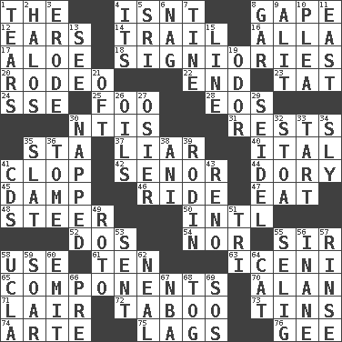 ACROSS 1. Definite Article 4. Is not 8. Stare wonderingly 12. Hearing organs 14. Drop behind 16. Silent film actress Nazimova 17. Medicinal plant 18. Seigniories (variant) 20. Cowboy competition 22. Conclude 23. Make lace 24. Compass dir. 25. Egg _ yung 28. Greek goddess of the dawn 30. Nuclear Threat Initiatives 31. Musical pauses 35. R.R. building 37. One who doesn't tell the truth 40. Slanted text style (abbr.) 41. Hoof sound 42. Sir (Sp.) 44. Dinghy 45. Moist 46. Travel on or in a vehicle 47. Erode 48. Guide 50. International (abbr.) 52. Two (Sp.) 54. And not 55. Title for a knight 58. Purpose 61. Nine, plus one 63. Ancient Celtic tribe of eastern Britain 65. Pieces 70. ____ Jay Lerner 71. Den 72. Off limits 73. Canisters 74. Johnson of "Laugh-In" 75. Straggles 76. Turn to the right DOWN 1. Pulls into pieces 2. Saint headwear 3. Eat (away) 4. It is 5. _ Lanka 6. Tired old horse 7. Prong on a fork 8. Slender fish 9. Came down and settled, as after flight 10. Entreaty 11. 90 degrees 13. Observe 15. Actor's bit 19. Aroma 21. Often (poetically) 26. Lubricates 27. Flexible twig of a willow tree 29. A glass for beer 30. Slept 32. Portico 33. Small pie 34. Mischievous 35. Narrow board 36. Heavy book 38. Cuckoo 39. "The Thinker" sculptor 41. Music discs 43. Western Nevada city 49. Printing process, for short 51. Three (prefix) 53. Transmitted 55. Former Milwaukee Brewers owner Bud 56. Silly 57. Wash lightly 58. Southern CA. univ. 59. Fly high 60. Send forth 62. Anneal 64. Feline 66. Before (prefix) 67. Basketball assoc. 68. Coat; cloak 69. Distress signal