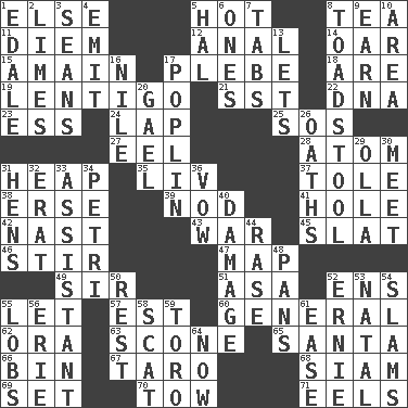 ACROSS 1. Otherwise 5. Being at a high temperature 8. Beverage made from leaves 11. South Vietnam president (1954) 12. Of or related to the anus 14. Boat paddle 15. At full speed 17. First-year military academy student 18. "We ___ not amused" (Victoria) 19. Small, flat, pigmented spot on the skin 21. Fast jet (abbr.) 22. Heredity factor (abbr.) 23. Curvy letter 24. Pet locale 25. Distress signal 27. Snakelike fish 28. Tiny particle 31. Pile 35. 54 in ancient Rome 37. Lacquered or enameled metalware 38. Celtic language 39. Lower and raise head in agreement 41. Opening into or through something 42. Political cartoonist Thomas 43. Armed conflict 45. Narrow board 46. Agitate 47. Atlas unit 49. Title for a knight 51. White ___ sheet 52. Followers of ems 55. Allow 57. Eastern Standard Time (abbr.) 60. Commissioned military rank 62. Mouth or opening 63. Biscuitlike quick bread 65. Before Barbara or Clara 66. Storage container 67. Pacific island yam 68. Thailand, formerly 69. Arrange properly for use 70. Pull behind 71. Snakelike fish DOWN 1. Peak District village in England 2. Citrus fruits 3. Actors Connery and Penn 4. Send forth 5. Actor Linden 6. Washington bills 7. Bar bills 8. Inedible or poisonous agaric 9. Merit 10. Length times width 13. Allows 16. "Death on the ____" 17. Cotton for raincoats, e.g. 20. Highlander 26. Profane or obscene expressions 29. Water jar 30. Rendezvous 31. Coop moms 32. Part of Q.E.F. 33. Aide 34. _ dish (used to culture cells) 36. Promise 40. Break 44. Raze (variant) 48. Baking dishes 50. State of inaction 52. Bert's buddy 53. Brizilian seaport 54. Criticizes harshly 55. Tennis shots 56. 4th largest of the Great Lakes 58. Leave at once 59. "Corrida" creature 61. Comfort 64. At this time