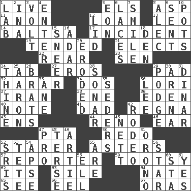 ACROSS 1. Moving, as bait 5. Raised railways 8. Viper 11. At once, immediately (arch.) 12. Rich soil 13. Lion 14. Greek mezzo-soprano Agnes 17. Event 19. Looked after 21. Chooses 22. Hitchcock's "____ Window" 23. Elected rep. 24. Keyboard key 27. Greek god of love 29. Writing tablet 32. Ethiopian city, capital of Harari 34. Two (Sp.) 36. Australian parrot (variant) 37. SW Asia republic 38. Compass dir. 39. Genesis locale 40. Short letter 41. Male parent 42. Canadian anthropologist Darnell 43. Followers of ems 44. Western Nevada city 46. Hearing organ 47. Parent Teacher Assoc. 50. Do over again 52. A viewer who gazes fixedly 55. Michaelmas daisies 57. News announcer 59. A girl or young woman (variant) 62. It is 63. Drop; flow; fall 64. Nathan's nickname 65. Observe 66. Snakelike fish 67. Mouths or openings DOWN 1. Experiment locale 2. _ tizzy (2 wds.) 3. Electrical Unit 4. Keyboard key 5. Age 6. Shoestrings 7. Grin 8. Actor Baldwin 9. Emitted 10. Plant holders 12. Hat (slang) 15. Contemptuous expression 16. The sixth month of the Jewish calendar 18. Lair 20. Worn away 24. One or ones belonging to thee 25. Composer Copland 26. Naughty children 28. Underwater navigation system 29. Porridge 30. Sports stadium 31. Middle Eastern gold or silver currency 33. A saturated hydrocarbon 35. Spring feasts 36. Area sheltered from the wind 42. Cowboy competition 45. Remaining after all deductions 47. Adept person 48. Laconic 49. Nick name for Arthur 51. U. of Maine site 52. Indian titles of respect 53. Wig 54. Domed church section 55. "We ___ not amused" (Victoria) 56. Play the lead 58. Pipe bend 60. R.R. building 61. Consenting reply