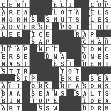 ACROSS 1. Penny 5. Connecticut Ivy Leaguer 8. Police officer (slang) 11. Length times width 12. Globular water bottle used in Asia 14. Raised railways 15. Typical standards 17. Particles of soot 18. French article 19. Contrary to your interests or welfare 21. Luau course 22. Car dealer's back yard 23. Area sheltered from the wind 24. Frozen water 25. Reproach for some lapse or misdeed 27. Plant excrement 28. Burn to charcoal 31. Pile 35. Born 37. Heavy book 38. Celtic language 39. Heredity factor (abbr.) 41. Singles 42. Vertical spar for supporting sails 43. Eastern Standard Time (abbr.) 45. Monthly bill 46. Use a spoon 47. Small child 49. Small drink 51. Supplement with great effort 52. Ocean 55. The first octave above the treble staff 57. The grampus (Milton) 60. Thinks logically 62. Sound made by sheep 63. Actors Connery and Penn 65. Table seasonings 66. Storage container 67. Drink excessively 68. It may be bright or harebrained 69. Nonscientific branch of learning 70. Compass dir. 71. Dormintory (informal) DOWN 1. Lessep's creation 2. Eat (away) 3. Boldness 4. Not wild 5. Shade tree 6. Central Nebraska county 7. "Tell ____ the Marines!" 8. Portable communications device 9. Margarine 10. Inconspicuous attention getter 13. SW Saudi Arabia district 16. Indian titles of respect 17. Oozed 20. Glance over 26. Thespian 29. So be it 30. Respite 31. Equivocates 32. Part of Q.E.F. 33. Aide 34. _ dish (used to culture cells) 36. Compass dir. 40. Michaelmas daisies 44. Casino tip 48. Afternoon social gatherings 50. Mail 52. Twentieth part of a lira 53. Keyboard key 54. Indian state 55. Swedish rock group 56. Den 58. Vintage cars 59. Smile enhancers 61. Stated 64. ___ Haven, CT