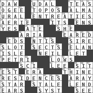 ACROSS 1. Simpleton 4. Hereditary estate 8. Beverages made from leaves 12. Double curve, resembling the letter S 14. Traditional theme or motif 16. _ mater 17. Mountain range 18. Pleas 20. Nest on high 22. It is 23. Followers of ems 24. Affirmative reply 25. Had dinner 28. A female animal or person 30. Operatic vocal solo 31. Having ears or earlike features 35. Begley and Asner 37. Nuclear Threat Initiatives 40. Father 41. Narrow opening 42. Religious groups 44. Flair 45. Small island 46. Famous astronaut Armstrong 47. Allow 48. _ dish (used to culture cells) 50. Moos 52. _-fi 54. Area sheltered from the wind 55. Be seated 58. Eastern Standard Time (abbr.) 61. Period 63. One or ones belonging to thee 65. Dwellings 70. Like ___ of sunshine 71. Play the lead 72. Lacking originality or spontaneity 73. Grant temporary use of 74. Hearing organs 75. System (abbr.) 76. Observe DOWN 1. A city in N France, SE of Calais 2. Match 3. Erodes 4. Shoshoni 5. Spanish title 6. Fitting 7. Australian parrot (variant) 8. Make lace 9. Writer Wiesel 10. So be it 11. Backtalk 13. Connecticut Ivy Leaguer 15. Arranges properly for use 19. American tennis player Robert 21. Hearing organ 26. Metal containers 27. Consumed 29. Artist's stands 30. Michaelmas daisies 32. Cause heat under the collar 33. Part of Q.E.F. 34. Lair 35. Otherwise 36. Dunce 38. Frozen water 39. Not moving 41. Small drink 43. A type of plum 49. On the rocks 51. Dripping 53. Angers 55. Male parents of animals 56. Silly 57. Miss Universe 1986, Barbara Palacios _ 58. Celtic language 59. Bristle 60. Russian ruler of old 62. Pismires 64. Actor Linden 66. Big collection agency 67. Island 68. Raised railways 69. Arrange properly for use