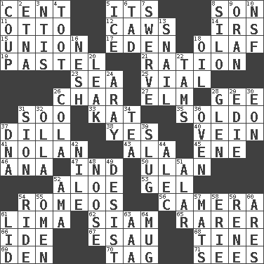 ACROSS 1. Penny 5. It is 8. Male offspring 11. "Beetle Bailey" pooch 12. Crow sounds 14. Big collection agency 15. The state of being joined or united 17. Genesis locale 18. Norwegian king 19. Soft color 21. Food allowance for one day 23. Ocean 25. Small bottle 26. Burn to charcoal 27. Shade tree 28. Turn to the right 31. "Barney Miller" actor Jack 33. Krazy ___ of comics 35. Twentieth part of a lira 37. Deli pickle 38. It is so 40. Distinctive style or manner 41. Pitcher Ryan 43. Insect wing 45. Compass dir. 46. Santa ___, CA 47. Indiana (abbr.) 50. ____ Bator, Mongolia 52. _ vera 53. Set 54. Lover boys 56. Device for capturing images 61. Pale green bean 62. Thailand, formerly 65. More uncommon 66. Binary compound 67. He sold his birthright 68. Prong on a fork 69. Lair 70. Label 71. Observes DOWN 1. Clever action or accomplishment 2. Inactive volcano in Sicily 3. Nuclear Threat Initiatives 4. A blast of a horn 5. Frozen water 6. Small amount or degree 7. Turn aside suddenly 8. Grain storage tower 9. Northwest Algerian city 10. Science/research agcy. 13. Slow-paced one 16. Delicate 18. Petroleum 20. Path through which fluid escapes 22. Scottish caps 24. Like ___ of sunshine 26. Root beer relative 28. Small, secluded valley 29. Singer Brickell 30. Age 31. The Jewish people; Israel 32. Rounded earthenware pot or jar 34. Afternoon social gathering 36. Baking chamber 37. Heredity factor (abbr.) 39. A hard, heavy blow 42. "Death on the ____" 44. Actor Baldwin 48. Trap for birds or small mammals 49. Cease 51. Having or resembling wings 52. Housemaid (var.) 54. Travel on an animal 55. Sign of things to come 57. Floor protectors 58. One of the Great Lakes 59. French philosopher Descartes 60. Ancient Greek god of war 61. Flaplike covering 63. Auto club (abbr.) 64. Large cup