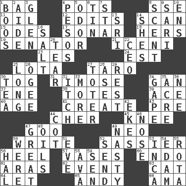 ACROSS 1. Paper or plastic container 4. Plant holders 8. Compass dir. 11. Petroleum 12. Prepares for publication 14. Examine hastily 15. Lyric poems 17. Echolocation 18. Possessive pronoun 19. Legislator 21. Ancient Celtic tribe of eastern Britain 23. French article 24. Eastern Standard Time (abbr.) 25. Globular water bottle used in Asia 27. Pacific island yam 30. Coat; cloak 31. Full of chinks, cracks, or crevices 34. Separate the seeds from cotton 37. Compass dir. 38. Lugs 39. Adept person 40. Mature 41. Make 43. Before (prefix) 44. "Mermaids" star 45. Leg joint 47. Thick or sticky substance 49. Modern: prefix 50. Compose 52. More impudent 56. Person who is morally reprehensible 57. Flower holders 60. Inside; within (prefix) 61. Ancient river in northeast Turkey 62. Incident 63. Domesticated feline 64. Allow 65. Actor Griffith 66. Wet nurse (var.) DOWN 1. Expressions of contempt or scorn 2. Assistant 3. Small, secluded valley 4. Mexican monetary units 5. Aroma 6. Metal container 7. R.R. building 8. Aroma 9. Indian skirt 10. Followers of ems 13. _ Lanka 14. "______ My Girl" (Turtles hit) 16. Table seasoning 20. Pull apart 22. Corporate head (abbr.) 25. Yearn 26. Double curve, resembling the letter S 27. Carrier 28. At sea 29. Respite 30. Beverage made from leaves 32. Hankering 33. Greater amount 34. Stare wonderingly 35. Land measure 36. Born 42. Supplements with great effort 44. Small bed 46. Characteristic smell of wine 47. Relatively large 48. Petroleums 49. Thoroughly unpleasant 50. We are 51. First lady 52. Post 53. South American Indian 54. Dutch treat 55. Round or rotation of duties 56. Actor Linden 58. Actress Gardner 59. Elected rep.