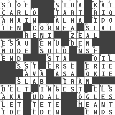 ACROSS 1. A type of plum 5. Portico 9. Krazy ___ of comics 12. Monte _, Las Vegas Hotel/Casino 14. Small pie 15. _ de Janeiro 16. With great haste 17. _ mater 18. Wedding promise 19. "___ Little Indians" 20. Pupil covering 23. Narrow board 24. Painter Guido (1575-1642) 25. Ardor 27. He sold his birthright 30. Australian flightless bird 32. Lair 33. Unadorned 34. Disposed of to a purchaser 36. Overdraft (abbr.) 38. Conclude 39. R.R. building 40. Petroleum 43. Fast jet (abbr.) 46. Celtic language 48. One of the Great Lakes 49. Actress Gardner 51. White ___ sheet 52. Migrant worker of the '30s 53. Thick slice 54. SW Asia republic 56. Waist strap 58. Eat 61. Raised railways 64. Alias (abbr.) 65. Freehold land 66. Stares 68. Allow 69. False hair 70. Intended 71. Binary compound 72. Paradise 73. Extremities DOWN 1. Jazz singing style 2. Unable to walk 3. NW Algerian seaport 4. Biblical high priest 5. Comedian Laurel of Laurel & Hardy 6. Lie 7. Chief deity of Zoroastrianism 8. _ moment's notice (2 wds.) 9. The principal food of baleen whales 10. Opera by Verdi 11. A blast of a horn 13. At one time in the past 21. Washington bills 22. Full of chinks, cracks, or crevices 23. Without 24. Regret 26. Car or cant ending 27. Compass dir. 28. Player for Phoenix 29. Sums up 31. Extremist 35. Small ungulate mammals of Africa 37. Tined utensil 41. One more than two 42. Area sheltered from the wind 44. Table seasoning 45. Federal power corp. 47. Hearing organs 48. A really long time 50. Remained 53. Schedule 55. Smallest unit of an element 56. Indonesian resort city 57. Made supply last 59. Nathan's nickname 60. Small, secluded valley 61. Style 62. Grant temporary use of 63. Fast planes 65. Shoshoni 67. Unit of force equal to gravity