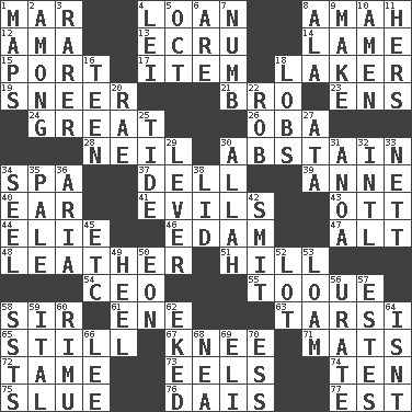 ACROSS 1. Impair 4. Grant temporary use of 8. Nanny 12. Nanny (var.) 13. Shade of tan 14. Unable to walk 15. Sweet dark-red dessert wine 17. A whole individual unit 18. Member of a famous L.A. basketball team 19. Contemptuous expression 21. Sis' sibling 23. Followers of ems 24. Relatively large 26. Chief or king in Benin or Nigeria 28. Famous astronaut Armstrong 30. Choose not to consume 34. Health resort 37. Small valley 39. Queen of England 1702-14 40. Hearing organ 41. Vices 43. Baseball player Mel 44. Writer Wiesel 46. Dutch treat 47. The first octave above the treble staff 48. Cordwainer's material 51. Land elevation 54. Corporate head (abbr.) 55. Woman's close-fitting hat 58. Title for a knight 61. Compass dir. 63. Tarsus (plural) 65. Not moving 67. Leg joint 71. Floor protectors 72. Docile 73. Snakelike fish 74. "___ Little Indians" 75. Change direction abruptly 76. Raised platform 77. Eastern Standard Time (abbr.) DOWN 1. Atlas contents 2. Amid 3. Less widely known 4. Flowery wreath 5. Sep. follower 6. "We ___ not amused" (Victoria) 7. Unfeeling 8. Insect wing 9. Cause to be 10. So be it 11. Possessive pronoun 16. Adolescent 18. Tennis shots 20. Actress Charlotte 22. Director Reiner 25. Periodic rise and fall of the sea level 27. _ moment's notice (2 wds.) 29. Prying instrument 30. Assad's deity 31. Small Philippine buffalo 32. International (abbr.) 33. Remaining after all deductions 34. Sew up the eyelids of hawks and falcons 35. Light colored 36. Operatic vocal solo 38. Flaplike covering 42. Stricken, poetically 45. And so on (abbr.) 49. The bottom of a shoe or boot 50. Age 52. Car dealer's back yard 53. Rich soil 56. A salt of uric acid 57. _____ Park, CO 58. Fast planes 59. Slanted text style (abbr.) 60. Tall New Zealand timber tree 62. Supplemented with great effort 64. Is not 66. Area sheltered from the wind 68. Teachers' org. 69. Biblical high priest 70. Curvy letter