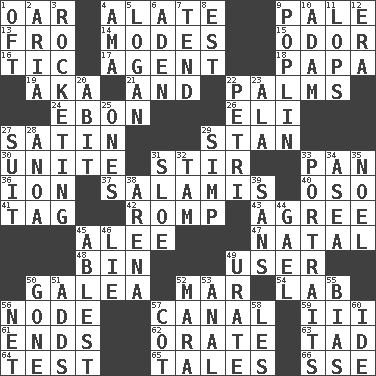 ACROSS 1. Rowing implement 4. Having winglike extensions 9. Light colored 13. Away 14. Methods 15. Aroma 16. Nervous spasm 17. Rep 18. Dad 19. Alias (abbr.) 21. Added to 22. Insides of hands 24. Inky black, to poets 26. Connecticut Ivy Leaguer 27. Smooth fabric 29. Comedian Laurel of Laurel & Hardy 30. Join together 31. Use a swizzle stick 33. Baking dish 36. Electrically charged atom 37. Deli grouping 40. Bear (Spanish) 41. Label 42. Frolic 43. Match 45. Toward shelter 47. Relating to or accompanying birth 48. Storage container 49. One who makes use of a thing 50. An organ shaped like a helmet 52. Impair 54. Experiment locale 56. Thickened enlargement 57. Lessep's creation 59. One more than two 61. Conclusions 62. Declaim 63. Bit 64. Trial 65. Falsehoods 66. Compass dir. DOWN 1. Often (poetically) 2. Operatic vocal solo 3. Shooting up abruptly 4. Nanny (var.) 5. Utah city north of Ogden 6. An important port of Yemen 7. Look after 8. Eastern Standard Time (abbr.) 9. Cotton for raincoats, e.g. 10. First of billions? 11. Chops off 12. Period 20. "This won't hurt ____!" 22. _ dish (used to culture cells) 23. According to 25. Singles 27. Costume for a special activity 28. Small Philippine buffalo 29. Simple or foolish person 31. A type of plum 32. Scottish cap 33. Likenesses of persons 34. Toward the sea 35. Christmas carol 38. Sports stadium 39. Without 44. Highlander 45. Most capable 46. Untruth 49. A salt of uric acid 50. Went 51. Sums up 52. Hindu Mythology: god of death 53. Of or related to the anus 55. Prejudice 56. Fish or hair follower 57. Small bed 58. French article 60. Binary compound