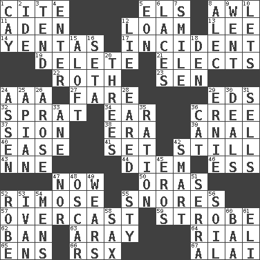 ACROSS 1. Quote 5. Raised railways 8. Leather borer 11. An important port of Yemen 12. Rich soil 13. Area sheltered from the wind 14. Gossips 17. Happening 19. Erase 21. Chooses 22. Writer of Portnoy's Complaint (1969) 23. Elected rep. 24. Auto club (abbr.) 27. Conductor's collection 29. Begley and Asner 32. Small fatty European fish 34. Hearing organ 36. Algonquian 37. The Jewish people; Israel 38. Epoch 39. Of or related to the anus 40. Relaxation 41. Put into a specified state 42. Free from disturbance or agitation 43. Compass dir. 44. South Vietnam president (1954) 46. Double-curved letter 47. Immediately 50. Mouths or openings 52. Full of chinks, cracks, or crevices 55. Sounds asleep 57. Cloudy 59. Disco prop 62. Forbid 63. Like ___ of sunshine 64. Monetary unit of Yemen 65. Followers of ems 66. Acura sports coupe 67. Jai _ DOWN 1. Island 2. Binary compound 3. Look after 4. Keyboard key 5. Period of immesurable duration 6. Shoestrings 7. Grin 8. Actor Baldwin 9. Gone 10. Allows 12. Falsehood 15. High up in or into the air 16. Bristle 18. Lair 20. Threesomes 24. NE Netherlands city 25. Bee-related 26. Came up 28. Having ears or earlike features 29. Bert's buddy 30. Allots cards 31. Makes a sale 33. A saturated hydrocarbon 35. Food allowance for one day 36. Feline 42. Don Adams' spy role 45. Greek god of love 47. Not either 48. Witty Wilde 49. Puts on (as clothing) 51. Father Junipero _ 52. Loose flowing garment 53. _ the terrible 54. Not women's 55. Filthy place 56. Land 58. Saxophone 60. Sound made by sheep 61. Biblical high priest