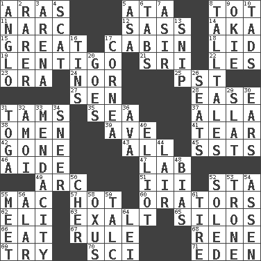 ACROSS 1. Caspian sea tributary 5. "One Day ___ Time" 8. Small child 11. Drug cop 12. Backtalk 14. Alias (abbr.) 15. Relatively large 17. Small house or cottage 18. Hat (slang) 19. Small, flat, pigmented spot on the skin 21. Indian title of respect (Mr.) 22. French article 23. Mouth or opening 24. Not either 25. Pacific Standard Time (abbr.) 27. Elected rep. 28. Relaxation 31. Scottish caps 35. Ocean 37. Silent film actress Nazimova 38. Sign of something about to happen 39. "___ Maria" 41. Rend 42. Went 43. 100% 45. Fast planes 46. Assistant 47. Experiment locale 49. Curve 51. One more than two 52. R.R. building 55. Big _ 57. Being at a high temperature 60. Speakers 62. Connecticut Ivy Leaguer 63. Honor 65. Grain storage towers 66. Ingest 67. Court order 68. French philosopher Descartes 69. Attempt 70. _-fi 71. Locale of original sin DOWN 1. White American of non-Hispanic descent 2. More uncommon 3. Sports stadium 4. Leave at once 5. White ___ sheet 6. Bar bills 7. SW Saudi Arabia district 8. Baron Munchausen's specialties 9. Migrant worker of the '30s 10. Small amounts or degrees 13. Clip 16. Canisters 17. Pupil covering 20. Moves 26. Theater features 29. Narrow board 30. Hearing organs 31. Ancient Roman robe 32. Mine, in Marseilles 33. Ananias' fault 34. Scornful expression 36. Actress Gardner 40. American author Paul (1891-1958) 44. Den 48. Prejudice 50. "Mermaids" star 52. Having a sole or soles 53. Marketplace scale 54. NE Netherlands city 55. Rendezvous 56. Having or resembling wings 58. The longest river in Central Asia 59. Baby powder 61. Hoop that covers a wheel 64. Flowery wreath