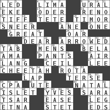 ACROSS 1. Directed 4. Pale green bean 8. Mountain range 12. Supplement with great effort 13. Baltic tributary 14. Western Nevada city 15. Small quarrel 17. False hair 18. Southeast Indonesia island 19. Contemptuous expression 21. One (Scot) 23. Single 24. Relatively large 26. Rowing implement 28. Letter starter 30. Moved like an arrow 34. Bar bill 37. Not women's 39. Actor Lugosi 40. Nursemaid (var.) 41. Leg coverings 43. Wind 44. Austrian-born American filmmaker Fritz 46. To provide with a ceiling 47. Area sheltered from the wind 48. Leopard's kin 51. Round or rotation of duties 54. Infant locale 55. Laconic 58. Accounting whiz (abbr.) 61. Shoshoni 63. Brizilian seaport 65. Small island 67. Jacques Cousteau's middle name 71. "Two Mules for Sister ____" 72. Russian ruler of old 73. Relaxation 74. Part of a journey 75. Inactive volcano in Sicily 76. Proofreading order 77. Begley and Asner DOWN 1. Allows 2. Supplementing with great effort 3. Put off 4. Car dealer's back yard 5. Binary compound 6. Was introduced to 7. Length times width 8. RI univ. 9. San ____ (Riviera town) 10. Soon (poet.) 11. Old wives' tales, e.g. 16. Nourish 18. Rend 20. Actress Charlotte 22. Not either 25. Pack (down) 27. Director Reiner 29. Arrive at 30. Being in motion 31. Welt 32. Writer Wiesel 33. Have the gumption 34. Baby powder 35. Wet nurse 36. Object of repulsion 38. Compass dir. 42. Slit 45. Set 49. Tense 50. Fitting 52. "___ Little Indians" 53. Caspian sea tributary 56. Showing deterioration from age 57. Having ears or earlike features 58. Quote 59. Inconspicuous attention getter 60. Actor Alda or Thicke 62. Sight organs 64. Straggles 66. Epoch 68. Large container 69. Compass dir. 70. Arrange properly for use