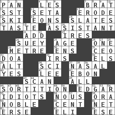 ACROSS 1. Baking dish 4. French article 7. Naughty child 11. Fast jet (abbr.) 12. Bristle 13. Eat (away) 14. What Jean-Claude Killy likes to do 15. Immeasurably long periods of time 16. Chalkboards 17. Clothes sense 19. Helper 21. Say or write further 23. Angers 24. Chop _ 25. Mature 26. Single 29. Distance measurement (Brit.) 30. Followers of ems 31. Corporate head (abbr.) 32. ___ good deed 33. Big collection agency 34. Raised railways 35. Keyboard modifier key 36. _-fi 37. Rhinal 40. It is so 41. Area sheltered from the wind 42. Inky black, to poets 43. Glance over 45. Everything 46. Conclusion 51. _ Allan Poe 55. Foolish or stupid persons 56. Horse sense 58. Mouth or opening 59. Having high moral qualities 60. Penny 61. Fish or hair follower 62. Celtic language 63. Biblical high priest 64. Compass dir. DOWN 1. Inconspicuous attention getter 2. "____ silly question..." 3. Nuclear Threat Initiatives 4. Lion 5. Inactive volcano in Sicily 6. Backtalk 7. Naughty children 8. Round or rotation of duties 9. Arabian gulf 10. Trial 12. Sowing specialist 13. Otherwise 16. Founders of families 18. Strained 20. Omens 22. Color 24. Theater features 25. Nest on high 26. Sea 27. 1994 drama film starring Jodie Foster 28. Greek goddess of the dawn 29. Undercover agent 32. 24 hours 33. Ancient Celtic tribe of eastern Britain 36. Narrow boards 37. Teachers' org. 38. Most capable 39. Disposed of to a purchaser 43. Took without asking 44. Quote 46. Trig term 47. Scent 48. Teases 49. Single time 50. Christmas carol 52. Went 53. Ancient Greek god of war 54. Pace 57. Single; one (prefix)