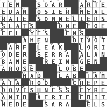 ACROSS 1. Nine, plus one 4. Fly high 8. Johnson of "Laugh-In" 12. Dutch treat 14. Flexible twig of a willow tree 16. Actress Patricia 17. Pace 18. Wine waiters 20. Narrow boards 22. Single 23. Enemy 24. Snakelike fish 25. Consenting reply 28. Followers of ems 30. So be it 31. A piece of turf (Scot.) 35. Sandy's bark 37. Path through which fluid escapes 40. Australian parrot (variant) 41. River in Europe 42. Spanish missionary in California 44. Actor Alda or Thicke 45. Object of repulsion 46. It's straight from the horse's mouth 47. Commissioned mil. rank 48. Came up 50. Ear part 52. Possessed 54. Experiment locale 55. Scottish cap 58. _ moment's notice (2 wds.) 61. Friend of Pooh 63. Streamer paper 65. Innocence, gentleness, or tenderness 70. Jane of fiction 71. Among 72. Nest on high 73. Prepare for publication 74. Ancient Persian 75. "Two Mules for Sister ____" 76. Raised railways DOWN 1. Laconic 2. Peak District village in England 3. Brizilian seaport 4. Distress signal 5. Bear (Spanish) 6. Direct toward a target or goal 7. San ____ (Riviera town) 8. Black tropical American cuckoo 9. Coral ridge 10. Edible starchy tuberous root 11. Otherwise 13. Was introduced to 15. French philosopher Descartes 19. Grant temporary use of 21. Symbol (abbr.) 26. Snakelike fish 27. Contemptuous expression 29. Fodder prepared in a silo 30. Anew 32. Grand slam 33. Northwest Algerian city 34. Shallow baking pan 35. The sixth month of the Jewish calendar 36. Former U.S. Attorney General Janet 38. "We ___ not amused" (Victoria) 39. Shrimp-like planktonic crustaceans 41. Chief or king in Benin or Nigeria 43. Small Philippine buffalo 49. Hearing organs 51. English channel? 53. Capital of the state of Qatar 55. Miss Universe 1986, Barbara Palacios _ 56. Showery time 57. Confronts 58. First man 59. Heavy book 60. Enthusiastic 62. Washington bills 64. To sift 66. Binary compound 67. Epoch 68. Title for a knight 69. Ocean
