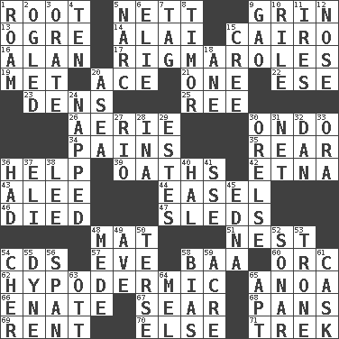 ACROSS 1. Carrot, for example 5. Remaining after all deductions 9. Amused look 13. Legendary monster 14. Jai _ 15. Capital of Egypt 16. ____ Jay Lerner 17. Complicated, petty procedures 19. Was introduced to 20. Adept person 21. Single 22. Compass dir. 23. Hiding places for outlaws 25. To separate or throw off 26. Nest on high 30. Southwest Nigerian state 34. Aches 35. Located in or toward the back 36. Aid 39. Curses 42. Inactive volcano in Sicily 43. Toward shelter 44. Artist's stand 46. Passed on 47. Bobsleighs 48. Floor protector 51. A home for chicks 54. Music discs 57. First lady 58. Sound made by sheep 60. The grampus (Milton) 62. Subcutaneous 65. Small Philippine buffalo 66. Related on the mother's side 67. Singe 68. Zero-star reviews 69. Monthly bill 70. Otherwise 71. Long journey DOWN 1. Wander 2. Stared at amorously 3. Speak pompously 4. "___ Little Indians" 5. Drug cop 6. Writer Wiesel 7. Label 8. The easternmost of the Lesser Sundas 9. E Mali city 10. Cause heat under the collar 11. Angers 12. Olfactory organ 15. Algonquian 18. One (Scot) 20. Toward the sea 24. Slept 27. _ de Janeiro 28. _ tizzy (2 wds.) 29. _____ Park, CO 30. Threatening words 31. Fish or hair follower 32. One of the 12 tribes of Israel 33. Mouth or opening 36. Possessed 37. Connecticut Ivy Leaguer 38. Area sheltered from the wind 40. Actor Linden 41. Compass dir. 45. Pulitzer Prize-winning author Ferber 48. Ancient Persian 49. "___ Maria" 50. Laconic 52. Underwater navigation system 53. Marketplace scale 54. "Mermaids" star 55. Unit of force 56. Connect, as a bridge 58. Prejudice 59. Measure of real estate 61. Keg 63. Baseball player Mel 64. Cartoonist voice _ Blanc 65. Fitting