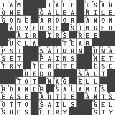 ACROSS 1. Scottish cap 4. Lie 8. Austrian river, tributary to the Danube 12. Single 13. An organ shaped like a helmet 14. Mediterranean tributary 15. Went 17. Zeal 18. Soon (poet.) 19. Contrary to your interests or welfare 21. Scorched 23. Wind 24. Big collection agency 26. To sift 27. Southern CA. univ. 28. Lacerate 30. 23rd letter of the Greek alphabet 31. Titan orbits this 34. Heredity factor (abbr.) 37. Put into a specified state 38. Aches 39. Soggy 40. Attempt 41. Cigar-shaped 42. Compass dir. 43. Make new 44. Table seasoning 46. Small child 47. Tired old horse 50. Pipe bend 51. Wanderer 54. Deli grouping 57. Comfort 58. Nick name for Arthur 60. Pismires 62. Von Bismarck 63. Moves on water 64. Set 65. "______ My Girl" (Turtles hit) 66. Suggestive of the supernatural 67. Filthy place DOWN 1. Coat; cloak 2. Small Philippine buffalo 3. Ananias' fault 4. Tarsus (plural) 5. Tree or shrub in the Birch family 6. Lion 7. Hearing organs 8. More lacking in sense or substance 9. Burn superficially 10. Medicinal plant 11. Tear apart 13. Slender fish 16. Morally bad or wrong 20. Period 22. SW Asia republic 25. Difficult or unusual or dangerous feat 27. One who makes use of a thing 29. Celtic language 30. Pacific Standard Time (abbr.) 31. Broke a traffic law 32. Composer Copland 33. Neckwear 34. Homes 35. A home for chicks 36. Had dinner 41. False hair 43. Lover boys 44. Ocean 45. _ mater 46. Clothes sense 48. Having gotten out of bed 49. Lightheartedly 51. Vintage cars 52. Pledge 53. Raze (variant) 55. French article 56. Proofreading order 59. Actress Charlotte 61. Stealthy