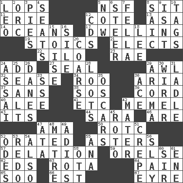 ACROSS 1. Chops off 5. Overdraft (abbr.) 8. Be seated 11. 4th largest of the Great Lakes 12. ____ d'Azur (French Riviera) 13. White ___ sheet 14. Seas 17. Home 19. Unemotional ones 21. Chooses 22. Grain storage tower 23. Actress Charlotte 24. Find the sum of 27. Lick closed 29. Leather borer 32. Gospel singer Marvin 34. Friend of Pooh 36. Operatic vocal solo 37. Without 38. Mayday 39. Drawstring 40. Toward shelter 41. And so on (abbr.) 42. Klaipeda city 43. ___ a Wonderful Life 44. "Two Mules for Sister ____" 46. "We ___ not amused" (Victoria) 47. Housemaid (var.) 50. College mil. group 52. Declaimed 55. Michaelmas daisies 57. Conveyance 59. Threatening words 62. Begley and Asner 63. Roll call or roster of names 64. Ache 65. "Barney Miller" actor Jack 66. Eastern Standard Time (abbr.) 67. Jane of fiction DOWN 1. Lion 2. The grampus (Milton) 3. Sliced desserts 4. Theater features 5. Immediately 6. Navigate 7. Chap (slang) 8. Ketch in the Levant 9. Is not 10. Labels 12. Music discs 15. Annoying sound 16. Drop; flow; fall 18. Area sheltered from the wind 20. Rough 24. Slender Brazilian palm 25. Started a card game 26. Natives or inhabitants of Denmark 28. Plunders 29. Odor 30. One who wires 31. Dipping utensil 33. Compass dir. 35. Motion picture awards 36. Adept person 42. Mother 45. Printing process, for short 47. _ moment's notice (2 wds.) 48. Distance measurement (Brit.) 49. Goodbye (Sp.) 51. Streamer paper 52. Lyric poems 53. Redecorate 54. In addition 55. Santa ___, CA 56. Kill 58. Baseball player Mel 60. Title for a knight 61. Compass dir.