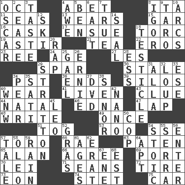 ACROSS 1. Sep. follower 4. Collude with 8. Call ___ day 11. Oceans 13. Erodes 15. Slender fish 16. Keg 17. Take place subsequently 18. Torque (variant) 19. Moving about 21. Beverage made from leaves 22. Greek god of love 23. To separate or throw off 24. Mature 27. French article 29. Coast Guard woman 30. Having lost freshness 34. Pacific Standard Time (abbr.) 36. Conclusions 39. Grain storage towers 40. Erode 41. Make or become more lively 43. A slight indication 44. Relating to or accompanying birth 46. Pulitzer Prize-winning author Ferber 47. Infant locale 48. Compose 49. Single time 51. Coat; cloak 53. Friend of Pooh 54. Compass dir. 57. "Corrida" creature 60. Actress Charlotte 63. Eucharist need 65. Actor Alda or Thicke 66. Match 69. Sweet dark-red dessert wine 70. Flowery wreath 71. Seines 72. Hoop that covers a wheel 73. Period of immesurable duration 74. Proofreading order 75. 4-wheeled motor vehicle DOWN 1. Motion picture award 2. Desist 3. Clothes sense 4. Deep reverence 5. Benjamin's nick name 6. 90 degrees 7. Loyal 8. Composer Stravinsky 9. Edible starchy tuberous root 10. Arches 12. What Jean-Claude Killy likes to do 14. Lick closed 18. One of the two male reproductive glands 20. Reproach for some lapse or misdeed 25. Highlander 26. Bert's buddy 28. Double-curved letter 29. Ski resort town in Vermont 31. Silent film actress Nazimova 32. Central Nebraska county 33. Compass dir. 34. Lightbulb-shaped fruit 35. Suttee (variant) 37. Movie disc 38. Sir (Sp.) 40. Compass dir. 42. Billionth: prefix 45. Lion 50. Police officer (slang) 52. Pate de foie ____ 54. Unemotional 55. Spanish missionary in California 56. Keyboard key 57. Lie 58. Margarine 59. Water falling in drops from the sky 61. Eons 62. Part of Q.E.F. 64. Fitting 67. Compass dir. 68. Eastern Standard Time (abbr.)