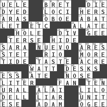 ACROSS 1. Ubangi River tributary 5. Cy Young winner Saberhagen 9. Expire 12. Colored 13. Locales 14. Possessive pronoun 15. Ancient river in northeast Turkey 16. Mitch Miller's instrument 17. Blind as ____ 18. Allow 19. And so on (abbr.) 21. Having winglike extensions 22. Hollow 24. HTML Container Element 26. Unit of force equal to gravity 27. Laconic 28. Flintstone garb 29. "Two Mules for Sister ____" 30. New (sp.) 32. Ancient Greek god of war 36. Proofreading order 37. River (Sp.) 38. Greater amount 39. Periodic rise and fall of the sea level 40. Clothes sense 42. 1/640 square mile 43. Electrical Unit 44. Writing tables 46. Double-curved letter 49. Had dinner 50. Olfactory organ 51. 61 cubic inches 53. Avid follower 54. Nine, plus one 57. Mountain range 58. Mountain range southwest of Kyrgyzstan 61. _ and Stitch 62. Small valley 63. One who doesn't tell the truth 64. A single undivided whole 65. Compass dir. 66. First man 67. Double curve, resembling the letter S DOWN 1. Hereditary estate 2. Jane of fiction 3. Tough but pliablecoriaceous 4. Begley and Asner 5. Group of countries in special alliance 6. Director Reiner 7. Environmental prefix 8. Make a knot 9. Debunk (Brit. slang) 10. Feeling or showing extreme anger 11. First name in cosmetics 14. Actor Linden 19. Raised railways 20. Adolescent 21. "___ Maria" 23. Declaim 24. A piece of turf (Scot.) 25. Wedding promise 27. Jacques of French films 28. Robbery 29. Fast jet (abbr.) 31. A salt of uric acid 32. Collect or gather 33. Shooting up abruptly 34. Blunders 35. Observe 40. Make lace 41. Pulitzer Prize-winning author Ferber 43. Armed conflict 45. Age 46. Dodge 47. Titles for men of rank and authority 48. Showing deterioration from age 52. Pipe bend 53. Securely fixed in place 55. Writer Wiesel 56. Make mention of 58. In the manner of 59. Flaplike covering 60. Auto club (abbr.) 61. Nilotic language