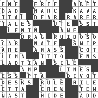 ACROSS 1. Compass dir. 4. 4th largest of the Great Lakes 8. Collude with 12. Male parent 13. Drug cop 14. Polynesian shrub of the pepper family 15. Slanted text style (abbr.) 17. Letter starter 18. More uncommon 19. Stories 21. Shoshoni 23. Fast jet (abbr.) 24. Soviet premier 1918-24 26. A saturated hydrocarbon 28. To trail on the ground 30. Boisterous (Brazilian Portuguese) 34. 4-wheeled motor vehicle 37. Nathan's nickname 39. Sever or remove by pinching or nipping 40. "We ___ not amused" (Victoria) 41. Collect or gather 43. Small bed 44. Pale green bean 46. "Tell ____ the Marines!" 47. Followers of ems 48. Of or relating to Laos or its people 51. Filth; sediment 54. Electrical Unit 55. Citrus fruits 58. Double-curved letter 61. Parent Teacher Assoc. 63. A piece of turf (Scot.) 65. Writing tables 67. Governing power 71. Cause heat under the collar 72. Singer James 73. Ship's personnel 74. Nine, plus one 75. Political cartoonist Thomas 76. Flintstone garb 77. Increase DOWN 1. Prepare for publication 2. Relating to or accompanying birth 3. Peak District village in England 4. Conclusion 5. Actress Charlotte 6. Retirement account (abbr.) 7. Shade of tan 8. Alias (abbr.) 9. Long, evenly shaped pieces 10. Nights before holidays 11. Small pie 16. Grant temporary use of 18. Painter Guido (1575-1642) 20. Title for a knight 22. The 19th letter of the Greek alphabet 25. Grandmother 27. Begley and Asner 29. Homeless child 30. Musical pauses 31. Single time 32. The Jewish people; Israel 33. Elects 34. Give a ring to 35. Roberta Peters solo 36. San ____ (Riviera town) 38. Make lace 42. Land 45. "One Day ___ Time" 49. Naughty children 50. Fitting 52. Hat (slang) 53. Arab leader 56. Webber/Rice musical 57. Having a sole or soles 58. Locale of original sin 59. Bristle 60. Fast planes 62. Bowlike part 64. Be inclined (to) 66. Krazy ___ of comics 68. RI univ. 69. Directed 70. She-sheep