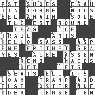 ACROSS 1. Pacific Standard Time (abbr.) 4. Imelda's hoard 9. He sold his birthright 13. Call ___ day 14. Singer Mel 15. Horse sense 16. Snakelike fish 17. At full speed 18. Not divided or shared with others 19. Affectionate concern, for short 21. Eastern Standard Time (abbr.) 22. Having a circular shape 24. Beverages made from leaves 26. Frozen water 27. Get behind 29. Pismires 30. Phone greeting 31. Backtalk 33. Viper 36. Compass dir. 37. Curse 40. Health resort 41. It is so 42. Toward shelter 43. NE Netherlands city 45. Former U.S. Attorney General Janet 47. Unmarried girls 48. Often (poetically) 49. Allows 50. Theater features 52. Connecticut Ivy Leaguer 54. ___ a Wonderful Life 56. Rich soil 57. _____ steamer (cargo ship) 59. Assist 61. Otherwise 62. Flexible twig of a willow tree 63. Compass dir. 64. Baltic tributary 65. Laconic 66. Nine, plus one DOWN 1. Sliced dessert 2. Proofreading order 3. Baron Munchausen's specialties 4. R.R. building 5. Residences 6. Mouths or openings 7. Give off 8. Elected rep. 9. Takes place subsequently 10. Within a short period 11. Old (Scot.) 12. Purpose 20. To provide with a ceiling 22. Remove soap 23. Sep. follower 25. Medicinal plant 27. Those things 28. French philosopher Descartes 29. American tennis player Robert 31. Grain storage tower 32. Had dinner 33. Aide 34. Hurried 35. Zero-star reviews 38. Leg coverings 39. Not wild 44. Suttee (variant) 45. Wanderer 46. Bank Draft (abbr.) 49. Citrus fruits 50. Disposed of to a purchaser 51. Comfort 52. Celtic language 53. Den 55. Trig term 56. Lion 57. Small child 58. Before (prefix) 60. Lair