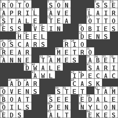 ACROSS 1. Printing process, for short 5. Male offspring 8. Compass dir. 11. Showery time 13. "___ Maria" 14. Den 15. Showing deterioration from age 16. Beverage made from leaves 17. Von Bismarck 18. Curvy letter 19. Distinctive style or manner 21. Off-Broadway awards 22. Person who is morally reprehensible 24. Habitations of wild animals 25. Motion picture awards 27. River (Sp.) 29. Tail end 30. Paris' subway 32. Queen of England 1702-14 33. Softens 35. Collude with 39. A sleeping potion; an opiate (poet.) 41. Indian skirt 42. Leather borer 43. Medicinal drug used to evoke vomiting 45. The sixth month of the Jewish calendar 48. Keg 49. Baking chambers 50. Proofreading order 52. Scottish cap 55. Water vessel 56. Perceive with the eye 57. Peak District village in England 59. Lubricates 60. Fenced enclosure 61. Thermoplastic polyamide 62. Begley and Asner 63. The first octave above the treble staff 64. Supplements with great effort DOWN 1. Raze (variant) 2. Chooses 3. File 13 4. Petroleum 5. Suttee (variant) 6. Baking chamber 7. Teachers' org. 8. Smooth fabric 9. Settings 10. Greek god of love 12. Prying instrument 14. Ear part 20. Raised railways 21. Aroma 23. Having ears or earlike features 25. Mouth or opening 26. Elected rep. 27. To sift 28. It is 30. Madame (abbr.) 31. Fertile tracts in a desert 33. The 23rd letter of the Hebrew alphabet 34. 100% 36. Sass 37. Period 38. Nervous spasm 40. Armed conflicts 43. Frozen water 44. Eucharist need 45. Stay clear from 46. Allots cards 47. Pismires 49. Mitch Miller's instrument 50. Stitch closed the eyes of (a falcon) 51. Portable shelter 53. Medicinal plant 54. Not women's 56. Health resort 58. Color