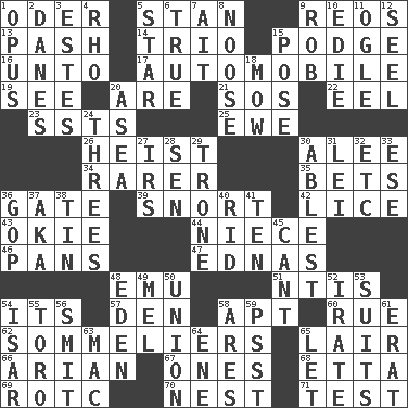 ACROSS 1. River in Europe 5. Comedian Laurel of Laurel & Hardy 9. Vintage cars 13. Romantic infatuation 14. Musical group of three 15. Puddle 16. To (old English) 17. Car 19. Observe 20. "We ___ not amused" (Victoria) 21. Mayday 22. Snakelike fish 23. Fast planes 25. She-sheep 26. Robbery 30. Toward shelter 34. More uncommon 35. Stakes 36. Yard entry 39. Derisive sound 42. Louse (plural) 43. Migrant worker of the '30s 44. Sibling's daughter 46. Zero-star reviews 47. Ferber et al. 48. Australian flightless bird 51. Nuclear Threat Initiatives 54. It is 57. Lair 58. Fitting 60. Sorrow 62. Wine waiters 65. Den 66. Believer in; advocate of (suffix) 67. Singles 68. Singer James 69. College mil. group 70. A home for chicks 71. Trial DOWN 1. Musical composition 2. Natives or inhabitants of Denmark 3. _____ Park, CO 4. 17th letter of the Greek alphabet 5. Play the lead 6. Loyal 7. Small island 8. Trap for birds or small mammals 9. Director Reiner 10. Singer Brickell 11. Stare at amorously 12. Sew up the eyelids of hawks and falcons 15. Airs 18. Cut the grass 20. At sea 24. Threesomes 27. Big collection agency 28. Elected rep. 29. Marketplace scale 30. Most capable 31. Flowery wreath 32. And so on (abbr.) 33. Compass dir. 36. Grand Old Party 37. Alias (abbr.) 38. Metal container 40. To free from 41. "___ Little Indians" 45. Patter 48. Genesis locale 49. Cartoonist voice _ Blanc 50. The state of being joined or united 52. Feeling or showing extreme anger 53. Sets of matching outer garments 54. Austrian river, tributary to the Danube 55. "Corrida" creature 56. Stricken, poetically 58. Ancient Greek god of war 59. Inconspicuous attention getter 61. Part of Q.E.F. 63. Apple computer (short form) 64. Compass dir. 65. Allow