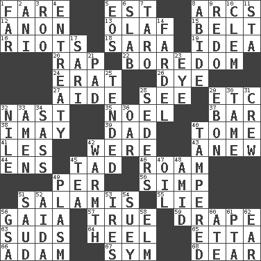 ACROSS 1. Conductor's collection 5. Eastern Standard Time (abbr.) 8. Arches 12. Soon (poet.) 13. Norwegian king 15. Waist strap 16. Disturbances 18. "Two Mules for Sister ____" 19. It may be bright or harebrained 20. Reproach for some lapse or misdeed 22. Mood resulting from idleness 24. Part of Q.E.F. 26. Color 27. Helper 28. Perceive with the eye 29. And so on (abbr.) 32. Political cartoonist Thomas 35. Christmas carol 37. Long, evenly shaped piece 38. "If ____ say so..." 39. June honoree 40. Heavy book 41. French article 42. We are 43. Afresh 44. Followers of ems 45. Small amount or degree 46. Wander 49. For each 50. Simple or foolish person 51. Deli grouping 55. Untruth 56. Greek goddess of the earth (variant) 57. Loyal 59. Window treatment 63. Beer foam 64. Person who is morally reprehensible 65. Singer James 66. First man 67. Symbol (abbr.) 68. Letter starter DOWN 1. At a great distance 2. Black tropical American cuckoo 3. Friend of Pooh 4. Plea 5. Greek goddess of the dawn 6. Broad, flat, thick piece 7. Edible starchy tuberous root 8. Stay 9. Redecorate 10. To starve (Brit.) 11. R.R. building 14. Pack 17. Indian skirt 21. Groovy apt. 23. Sight organ 25. Looked after 28. Spring feasts 29. Inky black, to poets 30. Not wild 31. Group working together 32. The longest river in the world 33. So be it 34. Backtalk 36. Rowing implement 40. ________ with (broke a safety seal) 42. Heat 45. Beverage made from leaves 47. Lubricate 48. Among 49. Suffix with ecto or cyto 51. Saudi Arabian king (1953-1964) 52. Opera by Verdi 53. Angers 54. Chop _ 56. Girls' org. (abbr.) 58. Shade tree 60. Had dinner 61. Parent Teacher Association (abbr.) 62. Hearing organ