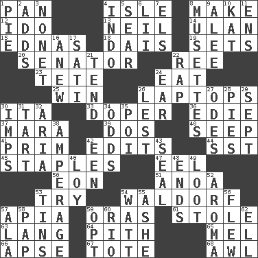 ACROSS 1. Baking dish 4. Capri or Wright 8. Cause to be 12. Wedding promise 13. Famous astronaut Armstrong 14. ____ Bator 15. Ferber et al. 18. Raised platform 19. Puts into a specified state 20. Elected representative 22. To sift 23. Wig 24. Consume 25. Acquire through effort 26. Portable computers 30. Call ___ day 33. Drug addict 36. Singer Brickell 37. Hindu Mythology: god of death 39. Two (Sp.) 40. Ooze 41. Demure 42. Proofreads 44. Fast jet (abbr.) 45. Paper fasteners 47. Snakelike fish 50. Period of immesurable duration 51. Small Philippine buffalo 53. Attempt 54. Apple salad 57. Capital of Western Samoa 59. Mouths or openings 61. Took without asking 63. Long (Scottish) 64. Heart or essence 65. Cartoonist voice _ Blanc 66. Domed church section 67. Carry 68. Leather borer DOWN 1. Sliced dessert 2. Does sums 3. Music written for nine 4. Southeast Asian peninsula 5. Wither 6. Cards in a Roman deck? 7. Raised railways 8. French bagpipes 9. Toward shelter 10. Krazy ___ of comics 11. Followers of ems 16. Afresh 17. Suttee (variant) 21. Be inclined (to) 22. Hit sharply and swiftly 24. Ewer handle 26. For fear that 27. Lyric poems 28. Sliced desserts 29. Back-to-school mo. 30. Naughty children 31. Small pie 32. Operatic vocal solo 34. Likelihood 35. Luau course 38. Electrical Measurement 42. Car or cant ending 43. Lick closed 46. Myrna of the movies 48. Extremities 49. Plunder 52. Scent 53. Metal containers 54. Electrical Unit 55. American tennis player Robert 56. Soared 57. Insect wing 58. Infant food 59. Choose 60. River (Sp.) 62. Pipe bend