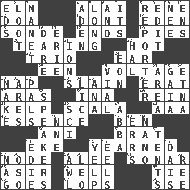 ACROSS 1. Shade tree 4. Jai ____ 8. French philosopher Descartes 12. ___ good deed 13. Do not 14. Locale of original sin 15. Message 18. Conclusions 19. Sliced desserts 20. Lacerating 22. Being at a high temperature 23. Musical group of three 24. Hearing organ 25. Car or cant ending 26. Electrical Measurement 30. Atlas unit 33. Killed 36. Part of Q.E.F. 37. Caspian sea tributary 39. _ tizzy (2 wds.) 40. It's straight from the horse's mouth 41. Seaweed 42. Any of the three canals of the cochlea 44. Auto club (abbr.) 45. Center 47. Benjamin's nick name 50. Black tropical American cuckoo 51. Naughty child 53. Supplement with great effort 54. Felt deep pity or tenderness 57. Connecting point 59. Toward shelter 61. Echolocation 63. SW Saudi Arabia district 64. Not ill 65. Standoff 66. Travels 67. Chops off 68. Compass dir. DOWN 1. Begley and Asner 2. Plunder 3. French painter Edouard 4. An important port of Yemen 5. Having great length 6. Also 7. ___ a Wonderful Life 8. Newsperson 9. Prepare for publication 10. Born 11. Followers of ems 16. Have the gumption 17. 4th largest of the Great Lakes 21. Charged atoms 22. Actor Linden 24. Age 26. Small bottle 27. Length times width 28. Greek goddess of the earth (variant) 29. Inactive volcano in Sicily 30. Cause to be 31. Ancient Greek god of war 32. Friends 34. Louse (plural) 35. Santa ___, CA 38. Orators 42. _-fi 43. Swedish rock group 46. Compass dir. 48. Blunders 49. Billionth: prefix 52. Portable shelters 53. Singer Brickell 54. Sharp bark 55. Snakelike fish 56. Raised platform 57. Tired old horse 58. Bear (Spanish) 59. Leather borer 60. Lion 62. To riddle