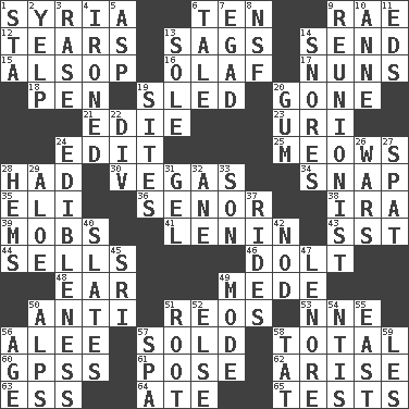 ACROSS 1. Damascus' land 6. "___ Little Indians" 9. Actress Charlotte 12. Pulls into pieces 13. Sinks 14. Post 15. Columnist Joseph or Stewart 16. Norwegian king 17. Religious women 18. Animal enclosure 19. Downhill vehicle 20. Went 21. Singer Brickell 23. RI univ. 24. Prepare for publication 25. Catcalls? 28. Possessed 30. Viva Las _ 34. Fastener 35. Connecticut Ivy Leaguer 36. Sir (Sp.) 38. Lyricist Gershwin 39. Disorderly crowds 41. Soviet premier 1918-24 43. Fast jet (abbr.) 44. Makes a sale 46. Stupid person 48. Hearing organ 49. Ancient Persian 50. Opposed to 51. Vintage cars 53. Compass dir. 56. Toward shelter 57. Exchanged or delivered for money 58. Add up to 60. Global Positioning Systems (abbr.) 61. Airs 62. Originate 63. Curvy letter 64. Had dinner 65. Trials DOWN 1. R.R. building 2. Sharp bark 3. To erase 4. Pressed 5. Viper 6. Lie 7. Mild oath 8. Overdraft (abbr.) 9. One who advocates reunion 10. Queen of England 1702-14 11. Begley and Asner 13. Flatfish 14. Sounds asleep 19. Locates 20. Chewing product 22. HTML Container Element 24. The property of being fit to eat 26. Armed conflicts 27. Argument over a trivial matter 28. Equivocates 29. _ vera 31. Set 32. A saturated hydrocarbon 33. Male offspring 37. Amusement-park features 40. Chalkboards 42. Lower and raise head in agreement 45. Indian title of respect (Mr.) 47. Poe poem 49. Method 50. High mountains 51. Carrot, for example 52. Otherwise 54. Nuclear Threat Initiatives 55. 90 degrees 56. Mature 57. Health resort 58. Make lace 59. French article