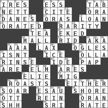 ACROSS 1. Angers 5. Double-curved letter 8. Keyboard key 11. Remaining after all deductions 12. Quote 14. Mouth or opening 15. Natives or inhabitants of Denmark 17. Mouths or openings 18. Grant temporary use of 19. Spoke pompously 21. Noteworthy scarcity 23. Beverage made from leaves 25. Made supply last 26. Shopping center 27. To free from 28. Alias (abbr.) 31. Auto club (abbr.) 33. Not strict 35. Stares 37. Is not 38. Frozen water 40. Spanish pot 41. Remove soap 43. Binary compound 45. Infant food 46. "We ___ not amused" (Victoria) 47. Shade tree 50. Ancient Greek god of war 52. Writer Wiesel 53. Russian fighter aircraft 54. Ridicules or criticizes harshly 56. One or the other 61. Fly high 62. Son of Isaac 65. Dinah or Pauly 66. Baseball player Mel 67. It's straight from the horse's mouth 68. Northwest Algerian city 69. Quiet! 70. Indian title of respect (Mr.) 71. Pace DOWN 1. Southeast Asian peninsula 2. Buttocks 3. Inactive volcano in Sicily 4. Proofreading order 5. Environmental prefix 6. Title for a knight 7. A viewer who gazes fixedly 8. A blast of a horn 9. Like ___ of sunshine 10. Bar 13. 1973 Nobel Price Winner (Physics) Leo 16. Stalk of a moss capsule 18. Hat (slang) 20. Small valley 22. Do over again 24. Mountain range southwest of Kyrgyzstan 26. Floor protectors 28. Silent film actress Nazimova 29. Seaweed 30. White ___ sheet 31. SW Saudi Arabia district 32. Queen of England 1702-14 34. One more than ninety 36. Republicans 37. Lyricist Gershwin 39. Dutch treat 42. Snakelike fish 44. 4th largest of the Great Lakes 48. 61 cubic inches 49. Makes clutter 51. Armor plate that protects the chest 52. Ewer handle 54. Writer of Portnoy's Complaint (1969) 55. Pledge 57. Son of Odin 58. Israeli folk dance 59. Part of Q.E.F. 60. French philosopher Descartes 61. Mayday 63. Wind 64. University (slang)