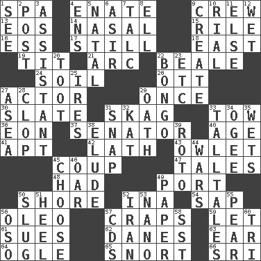 ACROSS 1. Health resort 4. Related on the mother's side 9. Group working together 13. Greek goddess of the dawn 14. Rhinal 15. Cause heat under the collar 16. Double-curved letter 17. Free from disturbance or agitation 18. 90 degrees 19. Teat (slang) 21. Curve 22. Calif. Air Force Base 24. Earth 26. Baseball player Mel 27. Thespian 29. Single time 30. Chalkboard 31. Heroin 33. Pull behind 36. Age 37. Elected representative 40. Grow older 41. Fitting 42. Thin strip of wood or metal 43. A small or young owl 45. Overturn; upset 47. Lies 48. Possessed 49. Sweet dark-red dessert wine 50. Dinah or Pauly 52. _ tizzy (2 wds.) 54. Plant excrement 56. Margarine 57. Dice game 59. Allow 61. Institutes legal proceedings 62. Natives or inhabitants of Denmark 63. Hearing organ 64. Stare at amorously 65. Derisive sound 66. _ Lanka DOWN 1. Perceive with the eye 2. Mail 3. Aide 4. Followers of ems 5. Brizilian seaport 6. SW Saudi Arabia district 7. Baby powder 8. Pipe bend 9. Cause to be 10. Monetary unit of Yemen 11. Otherwise 12. Soggy 20. A blast of a horn 22. Beat drum 23. And so on (abbr.) 25. Angers 27. At sea 28. Hoof sound 29. Pledge 31. Fastener 32. Krazy ___ of comics 33. Baron Munchausen's specialties 34. Double curve, resembling the letter S 35. Soaks 38. Dodge 39. Printing process, for short 44. Armed conflicts 45. Elect 46. Rowing implement 49. Some stationery 50. A hard, heavy blow 51. The bottom of a shoe or boot 52. SW Asia republic 53. Billionth: prefix 55. Lightbulb-shaped fruit 56. Bear (Spanish) 57. Music discs 58. Fast jet (abbr.) 60. Three (prefix)