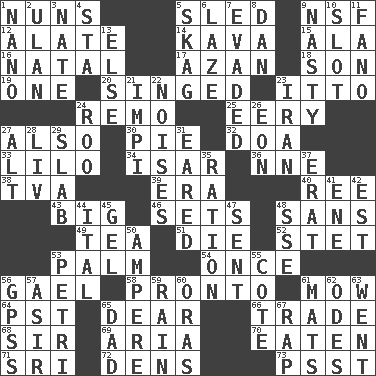 ACROSS 1. Religious women 5. Downhill vehicle 9. Overdraft (abbr.) 12. Having winglike extensions 14. Polynesian shrub of the pepper family 15. Insect wing 16. Relating to or accompanying birth 17. Muslim summons to prayer 18. Boy, to dad 19. Single 20. Burned superficially 23. "Tell ____ the Marines!" 24. San ____ (Riviera town) 25. Suggestive of the supernatural 27. In addition 30. Sliced dessert 32. ___ good deed 33. _ and Stitch 34. Austrian river, tributary to the Danube 36. Compass dir. 38. Federal power corp. 39. Epoch 40. To separate or throw off 43. Large 46. Puts into a specified state 48. Without 49. Beverage made from leaves 51. Expire 52. Proofreading order 53. Inside of hand 54. Single time 56. Highlander 58. Right away 61. Cut the grass 64. Pacific Standard Time (abbr.) 65. Letter starter 66. Barter 68. Title for a knight 69. Operatic vocal solo 70. Eroded 71. _ Lanka 72. Hiding places for outlaws 73. Inconspicuous attention getter DOWN 1. Billionth: prefix 2. ____ Bator 3. Nathan's nickname 4. R.R. building 5. Heroin 6. Goldbrick 7. Eluded 8. One of the 12 tribes of Israel 9. Smutty 10. Notch 11. Papal veil 13. Otherwise 21. Body of Kaffir warriors 22. Annoying sounds 23. SW Asia republic 24. Friend of Pooh 26. Age 27. The first octave above the treble staff 28. 54 in ancient Rome 29. Thick slice 31. Having ears or earlike features 35. Food allowance for one day 37. Part of Q.E.F. 41. Compass dir. 42. Eastern Standard Time (abbr.) 44. Slanted text style (abbr.) 45. Set 47. Transmitted 48. Compass dir. 50. Electrical Unit 53. _ dish (used to culture cells) 55. ____ d'Azur (French Riviera) 56. Global Positioning Systems (abbr.) 57. SW Saudi Arabia district 59. Precipitation 60. Mouths or openings 61. Floor coverings 62. Lyric poems 63. Gone 65. June honoree 67. Hit sharply and swiftly