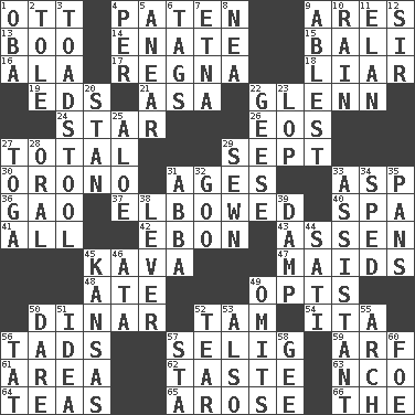ACROSS 1. Baseball player Mel 4. Eucharist need 9. Ancient Greek god of war 13. Oct. 31 cry 14. Maternal 15. Indonesian resort city 16. Chicken ___ king 17. Rain (Swedish) 18. One who doesn't tell the truth 19. Begley and Asner 21. White ___ sheet 22. American astronaut and politician John 24. Play the lead 26. Greek goddess of the dawn 27. "_____ Recall" 29. Back-to-school mo. 30. U. of Maine site 31. Matures 33. Cleo's killer 36. E Mali city 37. Turned at an angle; bent 40. Health resort 41. 100% 42. Inky black, to poets 43. NE Netherlands city 45. Polynesian shrub of the pepper family 47. Unmarried girls 48. Had dinner 49. Elects 50. Middle Eastern gold or silver currency 52. Scottish cap 54. Call ___ day 56. Small amounts or degrees 57. Major League Baseball Commissioner Bud 59. Sandy's bark 61. Type of rug 62. Clothes sense 63. Non-commissioned officer (abbr.) 64. Beverages made from leaves 65. Came up 66. Definite Article DOWN 1. Chief or king in Benin or Nigeria 2. Lacquered or enameled metalware 3. Inedible or poisonous agaric 4. For each 5. Approach 6. Labels 7. Inactive volcano in Sicily 8. Teachers' org. 9. Most capable 10. Precipitation 11. Flair 12. Title for a knight 20. Comedian Laurel of Laurel & Hardy 22. Honkers 23. Chop off 25. Medicinal plant 27. Ancient Roman robe 28. Relating to the mouth 29. Stitched 31. Swedish rock group 32. Thick or sticky substance 33. Helper 34. Drove too fast 35. Baking dishes 38. Crowbar 39. Moist 44. Suttee (variant) 45. Sunflower state 46. _ moment's notice (2 wds.) 49. Leaves out 50. Have the gumption 51. The content of cognition 52. Pull apart 53. In addition 55. Bowlike part 56. Make lace 57. R.R. building 58. Turn to the right 60. Enemy