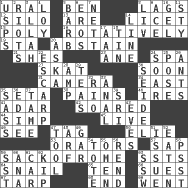 ACROSS 1. Mountain range 5. Benjamin's nick name 8. Straggles 12. Grain storage tower 13. "We ___ not amused" (Victoria) 14. It is permitted: Lat. 15. More than one (prefix) 16. Happening in regular succession 19. R.R. building 20. Choose not to consume 21. "______ My Girl" (Turtles hit) 23. One (Scot) 24. Health resort 27. Three-handed card game 30. Within a short period 31. Device for capturing images 34. Compass direction 35. Stalk of a moss capsule 38. Aches 40. Angers 41. The sixth month of the Jewish calendar 42. Flew 44. Simple or foolish person 45. Moving, as bait 46. Perceive with the eye 47. Label 50. Writer Wiesel 53. Speakers 57. Plant excrement 59. Italian handbag shop? 63. Fast planes 64. Slow-paced one 65. Nine, plus one 66. Takes to court 67. Canvas cover 68. Conclusion 69. Left DOWN 1. United States Postal Service (abbr.) 2. Debaucheries 3. Assad's deity 4. Myrna of the movies 5. Sharp remark 6. Greek god of love 7. Remaining after all deductions 8. 54 in ancient Rome 9. Adept person 10. Set 11. Filthy place 14. Actor's bit 17. Auto club (abbr.) 18. Shallow baking pan 20. "____ silly question..." 22. Fortification 24. Fly high 25. Introduce or present, as a question 26. Pismires 28. Electrical Unit 29. Beverages made from leaves 30. A glass for beer 32. _ de Janeiro 33. Of or related to the anus 35. Backtalk 36. Singer Brickell 37. Docile 39. Indian title of respect (Mr.) 43. Nights before holidays 47. Utensil 48. Sandy's bark 49. Slender fish 51. Come out of 52. Consumed 54. Carryall 55. Sign of something about to happen 56. Tear apart 58. Inconspicuous attention getter 59. Fast jet (abbr.) 60. Santa ___, CA 61. Auto 62. Monetary unit of Laos 63. Compass dir.