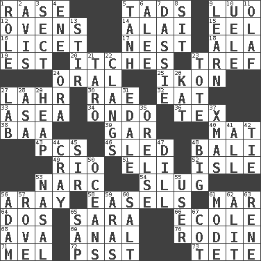 ACROSS 1. To erase 5. Small boys 9. Nilotic language 12. Baking chambers 14. Jai _ 15. Snakelike fish 16. It is permitted: Lat. 17. Egg locale 18. Insect wing 19. Eastern Standard Time (abbr.) 20. Skin irritations 23. Not kosher 24. Of the mouth 25. Image 27. Cowardly lion portrayer 30. Actress Charlotte 32. Consume 33. Toward the sea 34. Southwest Nigerian state 36. John Ritter's dad 38. Sound made by sheep 39. Slender fish 40. Floor covering 43. Personal Computers (abbr.) 46. Downhill vehicle 48. Indonesian resort city 49. River (Sp.) 51. Connecticut Ivy Leaguer 52. Capri or Wright 53. Drug cop 54. Strike heavily 56. Like ___ of sunshine 58. Artist's stands 61. Make imperfect 64. Two (Sp.) 65. "Two Mules for Sister ____" 66. Learning spot: Fr. 68. Actress Gardner 69. Of or related to the anus 70. "The Thinker" sculptor 71. Cartoonist voice _ Blanc 72. Inconspicuous attention getter 73. Wig DOWN 1. Hero or heavy, e.g. 2. Advice 3. Religious group 4. Compass dir. 5. Hyperbolic tangent 6. Toward shelter 7. Hyrax 8. Be seated 9. Acquire or gain knowledge or skills 10. Ubangi River tributary 11. Norwegian king 13. Commotion 21. Pacific island yam 22. Rings like a ship's bell 23. Carryall 24. Mouth or opening 26. Krazy ___ of comics 27. Experiment locale 28. White ___ sheet 29. Pile 31. Peak District village in England 35. Threatening words 37. Dec. holiday 41. Everything 42. Standoff 44. Supercomputer manufacturer 45. Title for a knight 47. Deli pickle 48. Massive 50. Seas 53. Relating to the nose 55. One who uses or employs something 56. First man 57. Be footloose 59. Ancient river in northeast Turkey 60. Table seasoning 61. Method 62. Set down 63. French philosopher Descartes 65. Plant excrement 67. Small bed