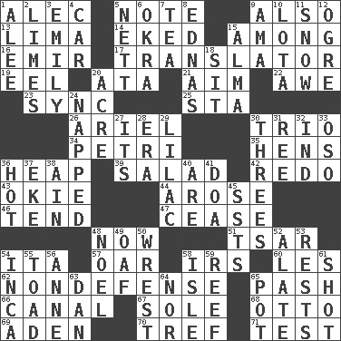ACROSS 1. Actor Baldwin 5. Make mention of 9. In addition 13. Pale green bean 14. Supplemented with great effort 15. Amid 16. Arab leader 17. Interpreter 19. Snakelike fish 20. "One Day ___ Time" 21. Direct toward a target or goal 22. Deep reverence 23. Synchronize (abbr.) 25. R.R. building 26. Satellite of Uranus 30. Musical group of three 34. _ dish (used to culture cells) 35. Coop moms 36. Pile 39. Vegetable dish 42. Make new 43. Migrant worker of the '30s 44. Came up 46. Be inclined (to) 47. Stop 48. Immediately 51. Russian ruler of old 54. Call ___ day 57. Rowing implement 58. Big collection agency 60. French article 62. Unrelated to defense, as in spending 65. Romantic infatuation 66. Lessep's creation 67. Not divided or shared with others 68. Von Bismarck 69. An important port of Yemen 70. Unclean, religiously 71. Trial DOWN 1. Toward shelter 2. Citrus fruits 3. Poet Dickinson 4. Automobile 5. Remaining after all deductions 6. Gumbo ingredient 7. Beverage made from leaves 8. Ferber et al. 9. Wet nurse (var.) 10. Globular water bottle used in Asia 11. Frozen precipitation 12. Legendary monster 15. _ mater 18. Be seated 20. Land measure 24. Slept 27. ___ a Wonderful Life 28. Epoch 29. Pale purple color 30. Triplets 31. To riddle 32. Indiana (abbr.) 33. Bear (Spanish) 36. Being at a high temperature 37. Supplement with great effort 38. The 18th letter of the Arabic alphabet 40. "We ___ not amused" (Victoria) 41. ___ good deed 45. Fast planes 48. Christmas carol 49. Clumsy lout 50. Take or capture by force 52. Having winglike extensions 53. Musical pauses 54. South American Indian 55. Frog relative 56. Singer Murray 58. Small island 59. Coral collection 61. Went for two points 63. One of the 12 tribes of Israel 64. And not 65. Plant holder