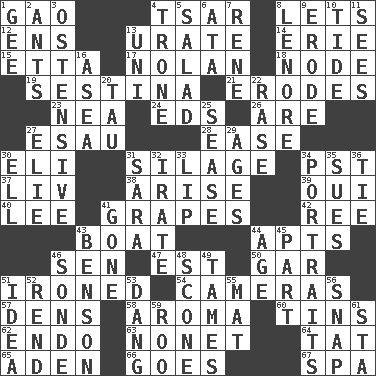 ACROSS 1. E Mali city 4. Russian ruler of old 8. Allows 12. Followers of ems 13. A salt of uric acid 14. 4th largest of the Great Lakes 15. Singer James 17. Pitcher Ryan 18. Connecting point 19. French poetic form 21. Eats (away) 23. Teachers' org. 24. Begley and Asner 26. "We ___ not amused" (Victoria) 27. Son of Isaac 28. Relaxation 30. Connecticut Ivy Leaguer 31. Fodder prepared in a silo 34. Pacific Standard Time (abbr.) 37. 54 in ancient Rome 38. Get up 39. Fr. "Yes" 40. Area sheltered from the wind 41. Raisin fruits 42. Portuguese money of account (variant) 43. Water vessel 44. Flats, for short 46. Elected rep. 47. Eastern Standard Time (abbr.) 50. Slender fish 51. Pressed 54. Devices for capturing images 57. Cub Scout units 58. Odor 60. Metal containers 62. Inside; within (prefix) 63. Music written for nine 64. Make lace 65. An important port of Yemen 66. Travels 67. Health resort DOWN 1. Unit of force equal to gravity 2. Pismires 3. Clearly or manifestly demonstrative 4. Heavy duty weighing machine 5. Vegetable dish 6. _ moment's notice (2 wds.) 7. French philosopher Descartes 8. Poe poem 9. Eat (away) 10. Periodic rise and fall of the sea level 11. Perceives with the eye 13. Single; one (prefix) 16. At sea 20. The 19th letter of the Greek alphabet 22. Raze (variant) 25. Gospel singer Marvin 27. Writer Wiesel 29. Eras 30. Pipe bend 31. "Two Mules for Sister ____" 32. Feeling or showing extreme anger 33. Mouth edge 34. Likenesses of persons 35. Takes to court 36. Neckwear 41. Went 43. Gillaume's butler role 44. Ripen 45. Piece 46. Message 48. Biscuitlike quick bread 49. Domesticates 51. The main thing one is thinking about 52. Tear apart 53. Mild oath, euphamism for damn 55. Floor protector 56. Fastener 59. Friend of Pooh 61. R.R. building