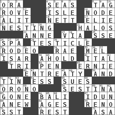 ACROSS 1. Mouth or opening 4. Oceans 8. Label 11. Be footloose 13. Small island 14. Thickened enlargement 15. Came down and settled, as after flight 16. Remaining after all deductions 17. Writer Wiesel 18. Snuggling 21. Saint headwear 22. Singer Murray 23. By way of 25. Compass dir. 26. Health resort 29. One of the two male reproductive glands 32. Cowboy competition 34. Actress Charlotte 35. Cartoonist voice _ Blanc 38. Austrian river, tributary to the Danube 39. Hold, grip (Informal) 41. Slanted text style (abbr.) 43. Three (prefix) 44. Fenced enclosure 45. Bert's buddy 46. Plea 50. Also 51. Shallow baking pan 54. Curvy letter 55. Takes to court 57. U. of Maine site 59. French poetic form 63. Went 64. Indonesian resort city 67. Goddess of spring and wife of Bragi 68. Afresh 69. Matures 70. Western Nevada city 71. Fast jet (abbr.) 72. Respite 73. White ___ sheet DOWN 1. Northwest Algerian city 2. Hero or heavy, e.g. 3. Opinion 4. Burns superficially 5. Compass dir. 6. Keyboard modifier key 7. Put into a specified state 8. For Whom the Bell _____ 9. Goodbye (Sp.) 10. Honkers 12. Singer James 14. Teachers' org. 19. To the inside or interior of 20. Compass dir. 21. Actor Linden 23. Small bottle 24. On the rocks 26. _ Lanka 27. Mail 28. The sixth month of the Jewish calendar 30. Marketplace scale 31. Independent ruler or chieftain 33. One of the Great Lakes 36. Inactive volcano in Sicily 37. (Had) reclined 39. Flats, for short 40. Possessive pronoun 42. Directed 45. Snake ____ (dice throw) 47. Modern: prefix 48. Aid 49. Third day of the wk. 51. Ancient Roman robes 52. Removes the wrinkles 53. Music written for nine 56. Use a swizzle stick 58. ___ Haven, CT 60. The content of cognition 61. Religious women 62. Small Philippine buffalo 64. Oblong piece of solid material 65. Mature 66. French article