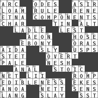 ACROSS 1. Curve 4. Lyric poems 8. SW Saudi Arabia district 12. Rich soil 14. General guideline 15. French philosopher Descartes 16. Inactive volcano in Sicily 17. Parts 20. Burn to charcoal 21. Shallow baking pan 22. The first octave above the treble staff 23. Dipping utensil 27. For fear that 29. Age 31. Stockings 34. Dark wood 35. Mouths or openings 36. Opera by Verdi 39. Playfully artful 41. United States Postal Service (abbr.) 42. Proofreading order 43. Unconcealed 46. Diluted with white 47. Tender 48. Of or related to the anus 51. Unemotional 54. Fish or hair follower 56. Cards in a Roman deck? 58. Play 61. The property of being fit to eat 66. Makes supply last 67. Small Philippine buffalo 68. Remaining after all deductions 69. Elected reps. 70. Austrian-born American filmmaker Fritz 71. Kill 72. Fast jet (abbr.) DOWN 1. Actor Baldwin 2. Writer of Portnoy's Complaint (1969) 3. Lessep's creation 4. The grampus (Milton) 5. Superhero pair 6. Shade tree 7. Back-to-school mo. 8. "We ___ not amused" (Victoria) 9. Legislators 10. International (abbr.) 11. Repose 13. Hindu Mythology: god of death 18. Petroleum 19. Compass dir. 24. Small moist lump or mass 25. Lion 26. Immeasurably long periods of time 28. Yell 30. Thermoplastic polyamide 32. Plant excrement 33. Double-curved letter 34. Eroded 36. Viper 37. Call ___ day 38. Conveyance 40. Jacques Cousteau's middle name 44. Eastern Standard Time (abbr.) 45. 17th letter of the Greek alphabet 49. 100% 50. Untruth 52. Angers 53. Popular sodas 54. Actress Patricia 55. Pulitzer Prize-winning author Ferber 57. Lodging establishments 59. Not women's 60. Inconspicuous attention getter 62. Paper or plastic container 63. Snakelike fish 64. R.R. building 65. Filthy place