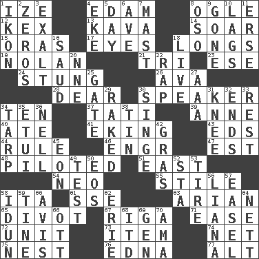 ACROSS 1. Ending with capital 4. Dutch treat 8. Stare at amorously 12. Dry husk or covering 13. Polynesian shrub of the pepper family 14. Fly high 15. Mouths or openings 17. Sight organs 18. Yearns 19. Pitcher Ryan 21. Three (prefix) 23. Compass dir. 24. Feeling sharp psychological pain 26. Actress Gardner 28. Letter starter 30. Orator 34. Nine, plus one 37. Jacques of French films 39. Singer Murray 40. Had dinner 41. Supplementing with great effort 43. Begley and Asner 44. General guideline 46. Engineer (abbr.) 47. Eastern Standard Time (abbr.) 48. Manned the helm 51. 90 degrees 54. Modern: prefix 55. Vertical member of a panel or frame 58. Call ___ day 61. Compass dir. 63. Believer in; advocate of (suffix) 65. A piece of turf (Scot.) 67. Port city in Latvia 71. Relaxation 72. A single undivided whole 73. A distinct part 74. Fish or hair follower 75. Egg locale 76. Pulitzer Prize-winning author Ferber 77. Keyboard modifier key DOWN 1. Picture 2. Nothings 3. Honor 4. Supplement with great effort 5. 24 hours 6. "___ Maria" 7. Vertical spar for supporting sails 8. Bear (Spanish) 9. Went 10. Falls behind 11. Celtic language 16. Saudi Arabian king (1953-1964) 18. Not recorded 20. Compass dir. 22. Hit sharply and swiftly 25. Yard entry 27. Auto club (abbr.) 29. Moved through 30. Scorch 31. Leg joint 32. Extremities 33. Take ten 34. Canvas cover 35. Needle holder 36. 1994 drama film starring Jodie Foster 38. Shallow baking pan 42. Pate de foie ____ 45. A really long time 49. Trial 50. Greek goddess of the dawn 52. R.R. building 53. Hoop that covers a wheel 56. Climbing, woody, usually tropical vines 57. Artist's stand 58. Goddess of spring and wife of Bragi 59. Prong on a fork 60. Deliberation 62. One of the Great Lakes 64. Remaining after all deductions 66. Baseball player Mel 68. It would 69. Commissioned mil. rank 70. Nanny (var.)