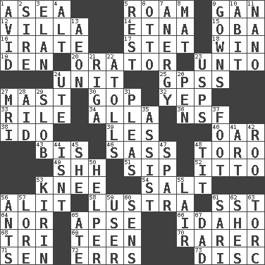 ACROSS 1. At sea 5. Wander aimlessly 9. Separate the seeds from cotton 12. Country estate 14. Inactive volcano in Sicily 15. Chief or king in Benin or Nigeria 16. Feeling or showing extreme anger 17. Proofreading order 18. Acquire through effort 19. Lair 20. Speaker 23. To (old English) 24. A single undivided whole 25. Global Positioning Systems (abbr.) 27. Vertical spar for supporting sails 30. Republican Party 32. Slangy assent 33. Cause heat under the collar 34. Silent film actress Nazimova 36. Overdraft (abbr.) 38. Wedding promise 39. French article 40. Rowing implement 43. Twice 46. Backtalk 48. "Corrida" creature 49. Quiet! 51. Small drink 52. "Tell ____ the Marines!" 53. Leg joint 54. Table seasoning 56. Came down and settled, as after flight 58. A period of five years 61. Fast jet (abbr.) 64. Not either 65. Domed church section 66. Potato state 68. Three (prefix) 69. Adolescent 70. More uncommon 71. Elected rep. 72. Blunders 73. Plate DOWN 1. Enthusiastic 2. The founder of a family 3. Flair 4. The first octave above the treble staff 5. Relief 6. "Beetle Bailey" pooch 7. Disorder of the immune system 8. Floor protector 9. Women's formal wear 10. "This won't hurt ____!" 11. Billionth: prefix 13. Age 21. Port city in Latvia 22. Ringlike coral islands and reefs 23. United States Postal Service (abbr.) 24. Shoshoni 26. Animal enclosure 27. Medical imaging device (abbr.) 28. Help 29. Messy guy 31. Entreaties 35. Help 37. One third of a yard 41. Tate display 42. Friend of Pooh 44. Is not 45. A female animal or person 47. Coast Guard woman 48. Teat (slang) 50. Aide 53. Japanese brewing company 55. Den 56. Pismires 57. Old wives' tales, e.g. 59. One who makes use of a thing 60. Elected reps. 61. Indian skirt 62. "______ My Girl" (Turtles hit) 63. Torque (variant) 65. Had dinner 67. Male parent