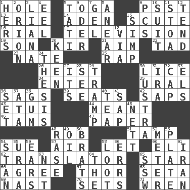 ACROSS 1. Opening into or through something 5. Ancient Roman robe 9. Inconspicuous attention getter 13. One of the Great Lakes 14. Arabian gulf 15. Turtle shell scale 16. Monetary unit of Yemen 17. Household entertainment appliance 19. Manchild 20. Apertif with cassis 21. Direct toward a target or goal 22. Small boy 23. Nathan's nickname 25. Reproach for some lapse or misdeed 26. Robbery 30. Louse (plural) 34. Keyboard key 35. Mountain range 36. Droops 39. Theater features 42. Plant excrements 43. Needle holder 44. Intended 46. Scottish caps 47. Some stationery 48. Director Reiner 51. Pack (down) 54. Institute legal proceedings 57. Wind 58. Allow 60. Biblical high priest 62. Interpreter 65. Play the lead 66. Match 67. Son of Odin 68. Bristle 69. Political cartoonist Thomas 70. Arranges properly for use 71. Songbird DOWN 1. Possessive pronoun 2. Greek mythologigal hunter 3. Woody, climbing, usually tropical plant 4. Snakelike fish 5. Jacques of French films 6. Baltic tributary 7. Set 8. Approach 9. Personal Computers (abbr.) 10. Set or collection 11. Portico 12. Watch over 15. Simple or foolish person 18. By way of 20. Peachy ____! 24. College paper 27. It is 28. Observe 29. _____ steamer (cargo ship) 30. A period of five years 31. Lyricist Gershwin 32. Head covering 33. Raised railways 36. Arrange properly for use 37. _ moment's notice (2 wds.) 38. Chewing product 40. Afternoon social gathering 41. Plant excrement 45. Remaining after all deductions 48. To erase 49. Lubricate 50. Naughty children 52. Distance measurement 53. Food holder 54. Comedian Laurel of Laurel & Hardy 55. Capital and largest city of Mongolia 56. Hearing organs 58. Plunder 59. Blunders 61. SW Asia republic 63. Fish or hair follower 64. Definite Article 65. Compass dir.