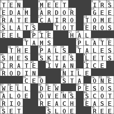 ACROSS 1. Nine, plus one 4. Rendezvous 8. Big collection agency 11. Dutch treat 13. Zeal 15. Turn to the right 16. Assign a rank or rating to 17. Capital of Egypt 18. Heavy book 19. Narrow boards 21. Small child 22. Greek god of love 23. Snakelike fish 24. Sliced dessert 27. Actor Linden 29. Scottish caps 30. Food holder 34. Definite Article 36. Friends 39. Lies 40. "______ My Girl" (Turtles hit) 41. Atmospheres 43. Allows 44. Feeling or showing extreme anger 46. "Terrible" tsar 47. Frozen water 48. "The Thinker" sculptor 49. The longest river in the world 51. Corporate head (abbr.) 53. R.R. building 54. Single 57. Not ill 60. Morning condensation 63. Mexican monetary units 65. Medicinal plant 66. Baking chambers 69. Highlander 70. River (Sp.) 71. Arrive at 72. Comfort 73. Put into a specified state 74. _ gin 75. To sift DOWN 1. Laconic 2. Peak District village in England 3. Relating to or accompanying birth 4. Apple computer (short form) 5. Period 6. Prepare for publication 7. "Corrida" creature 8. Composer Stravinsky 9. San ____ (Riviera town) 10. Observes 12. Was introduced to 14. Writer of Portnoy's Complaint (1969) 18. Copy Pinocchio 20. Health resort 25. Naughty children 26. 1973 Nobel Price Winner (Physics) Leo 28. Fitting 29. A testis 31. Actor Baldwin 32. False hair 33. Curvy letter 34. Through, poetically 35. Froth on beer 37. 54 in ancient Rome 38. Actors Connery and Penn 40. Title for a knight 42. In a ____ (agitated or irritated) 45. Compass dir. 50. Infant locale 52. Aroma 54. Motion picture award 55. Trap for birds or small mammals 56. First name in cosmetics 57. Armed conflicts 58. Writer Wiesel 59. Spoils 61. Nights before holidays 62. Welt 64. Compass dir. 67. Non-commissioned officer (abbr.) 68. A female animal or person