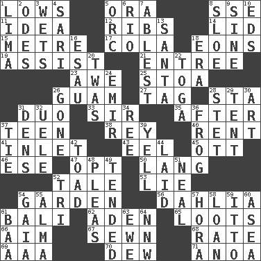 ACROSS 1. Coldest temperatures 5. Mouth or opening 8. Compass dir. 11. The content of cognition 12. Teases 14. Flaplike covering 15. Distance measurement (Brit.) 17. Root beer relative 18. Immeasurably long periods of time 19. Help 21. Main course 23. Deep reverence 25. Portico 26. Island territory of the United States 27. Label 28. R.R. building 31. Superhero pair 33. Title for a knight 35. Following 37. Adolescent 38. Marina Del _, California 40. Monthly bill 41. An arm off of a larger body of water 43. Snakelike fish 45. Baseball player Mel 46. Compass dir. 47. Choose 50. Austrian-born American filmmaker Fritz 52. Lie 53. Untruth 54. Place where plants grow 56. A pale violet or amethyst color 61. Indonesian resort city 62. Arabian gulf 65. Plunders 66. Direct toward a target or goal 67. Stitched 68. Pace 69. Auto club (abbr.) 70. Morning condensation 71. Small Philippine buffalo DOWN 1. Pale green bean 2. Lyric poems 3. Soaks 4. Indian skirt 5. The grampus (Milton) 6. _ de Janeiro 7. Most capable 8. A type of plum 9. Trig term 10. Begley and Asner 13. Before Barbara or Clara 16. He sold his birthright 18. Period 20. It was, poetically 22. Ancient Roman robe 24. Independent ruler or chieftain 26. Went 28. Proofreading order 29. Portable shelter 30. Tate display 31. Cub Scout units 32. Ubangi River tributary 34. To sift 36. Tree-dwelling hopper 37. Neckwear 39. Shout 42. Frog relative 44. Put down 48. Entreaties 49. Watched over 51. Actress Patricia 52. Three (prefix) 54. Greek goddess of the earth (variant) 55. _ mater 57. Israeli folk dance 58. Grant temporary use of 59. "Tell ____ the Marines!" 60. At sea 61. Sound made by sheep 63. She-sheep 64. Compass dir.